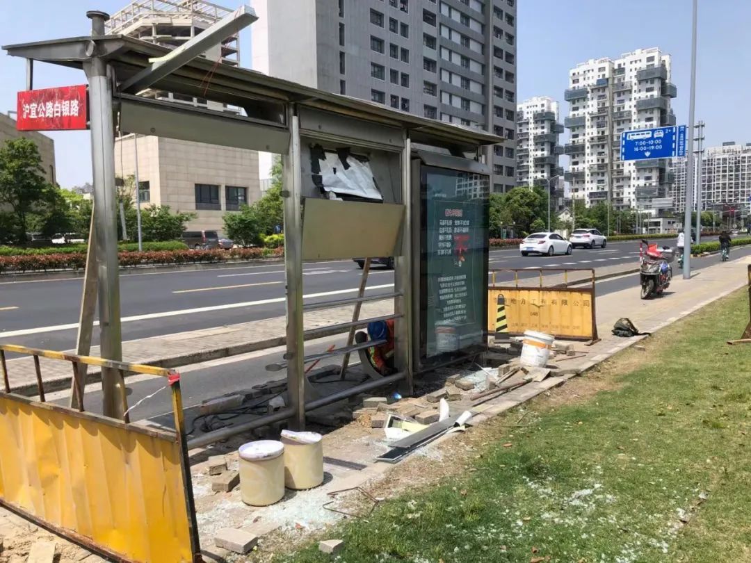 昨晚9点多,沪宜公路白银路上一公交站台被大风吹倒,玻璃显示板全部摔碎,地上狼藉一片,相关部门连夜抢修。今天上午,记者赶到事发地,现场已经竖起警戒牌,倒地的站台已经被竖立起来,施工人员正在进行加固,今天将全部修好。