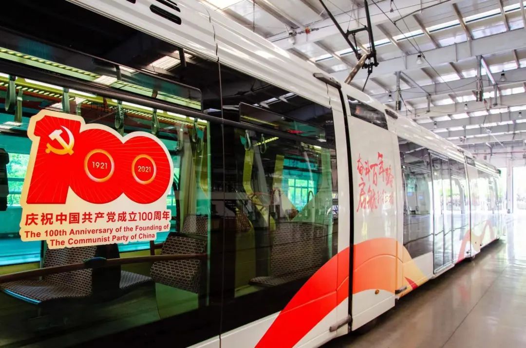 为了庆祝中国共产党成立100周年,浦东公交立足于创设特色党史学习教育阵地,把“张江有轨电车”与“移动党史馆”两大特色元素有机结合,推出“庆祝中国共产党成立100周年红色系列专列”有轨电车。