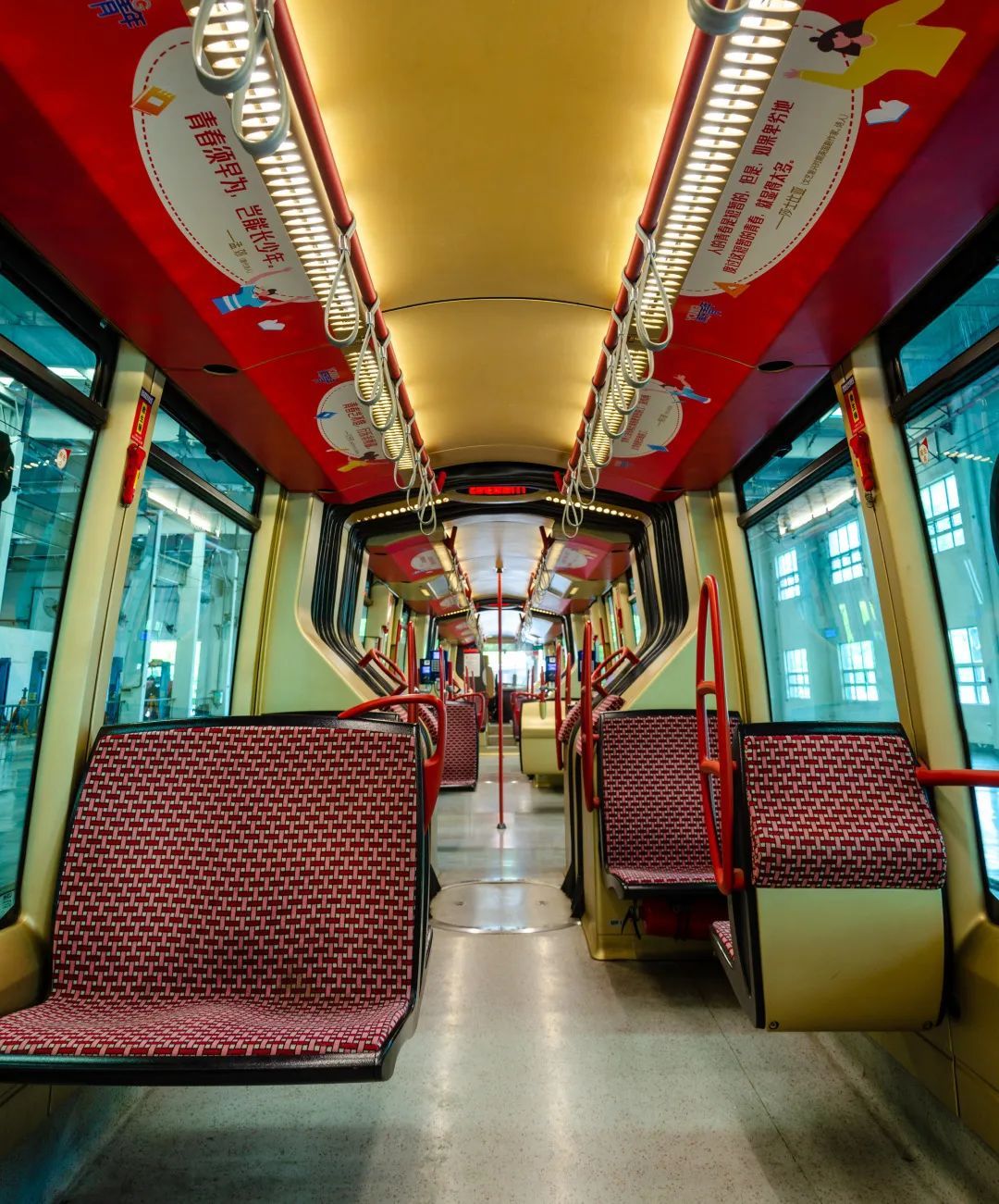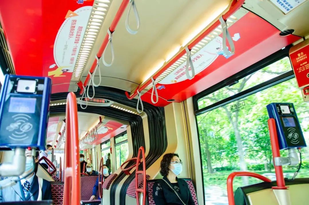 车辆以中国红为主基调,运用大量文字、图片、史料等红色经典元素,为市民的出行带来便利的同时,也让他们纵览党史风云,感受改革变迁。详见下文~