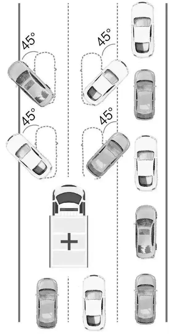 在拥堵的车道上,车辆可以分别向自己左右前方45度或相关角度侧身转向,在中间留出空间,供特种车辆通行。