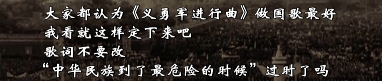 最后是毛主席一锤定音“大家都认为《义勇军进行曲》做国歌最好,我看就这样定下来吧。歌词不要改,‘中华民族到了最危险的时候’过时了吗?我看没有。我国人民经过艰苦斗争终于胜利了,但是还是受着帝国主义的包围,不能忘记帝国主义对我们的压迫。我们要争取中国完全独立解放,还要进行艰苦卓绝的斗争,所以还是原词好”。