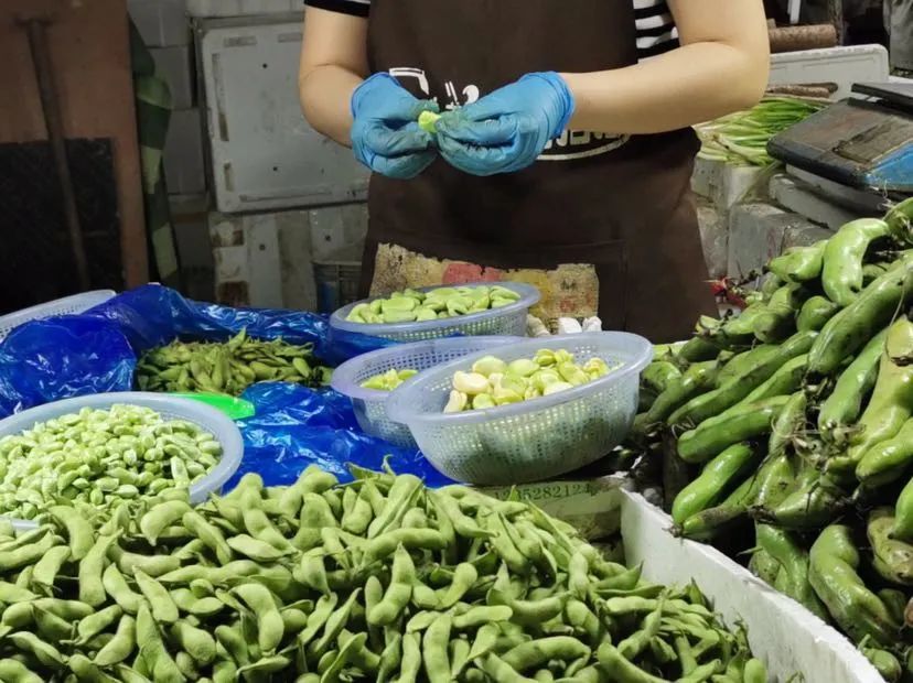 本地蚕豆还剩一星期左右就将下市,而另一边刚“上新”的本地毛豆,新鲜、饱满、粒大,即将代替蚕豆的位置“唱主角”。