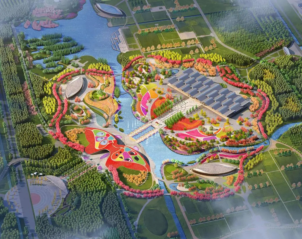 布局为“一心、一轴、六馆、六园”,“一心”为“梦花园”核心区,以牡丹花为构图元素,通过花海、花径、花溪、花谷,整体营造出了“牡丹绽放,喜迎盛世”的花博园区优美景观;“一轴”为花博轴,连通南园、迎宾广场、世纪馆、复兴广场、复兴馆和东平小镇,沿线布置花坛、花廊、花桥、花柱;“六馆”为复兴馆、世纪馆、竹藤馆、百花馆、花艺馆和花栖堂。园区内还建造了玉兰、梅花、菊花、兰花、荷花和竹园六大展园。