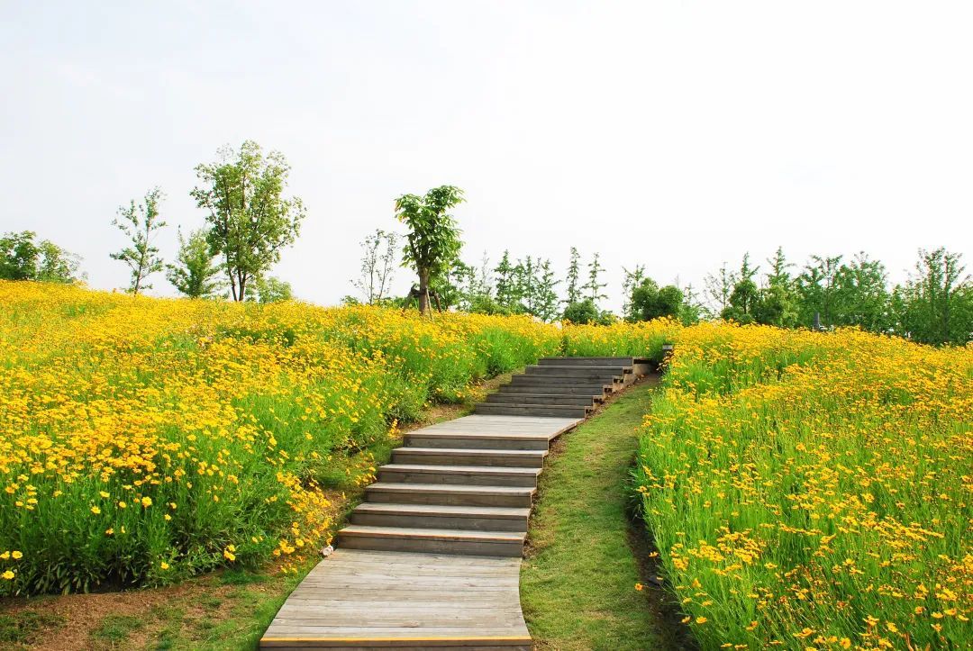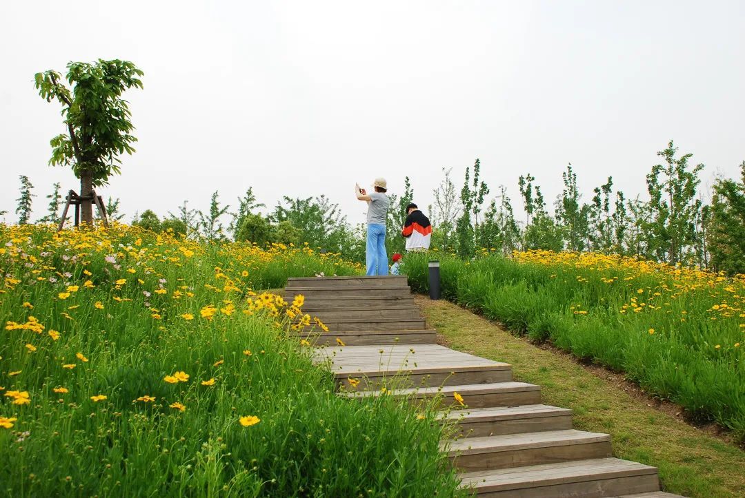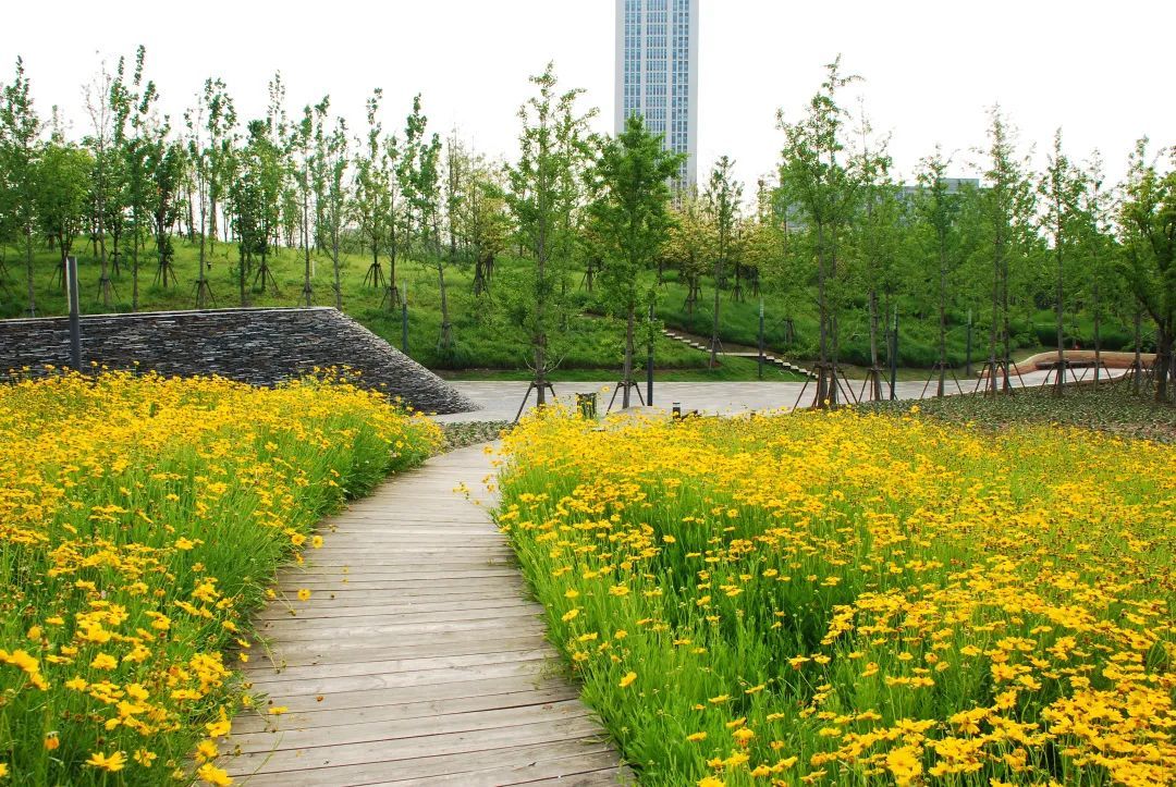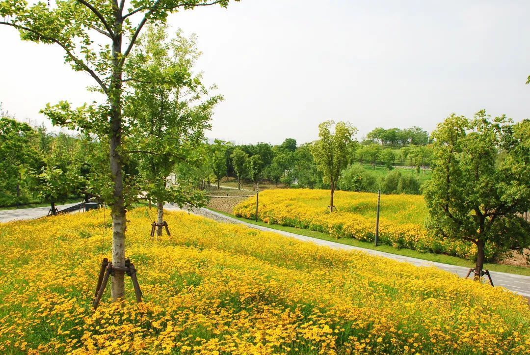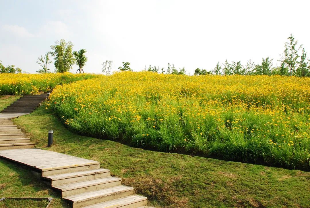 这三片花海呈现出金色、粉色、蓝色三种色调,形成了强烈的视觉冲击,带给游客们视觉享受,再配合周边其他花灌木的衬托,让游客们得到一种心情的释放。