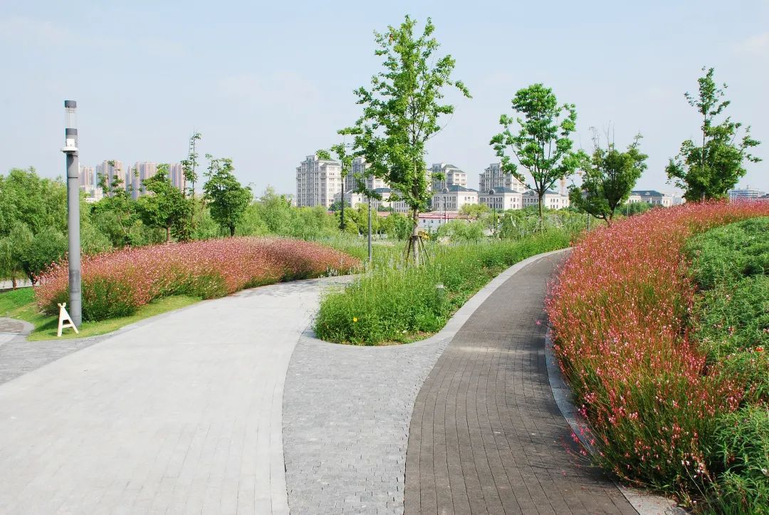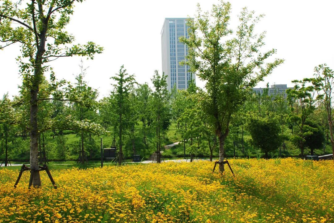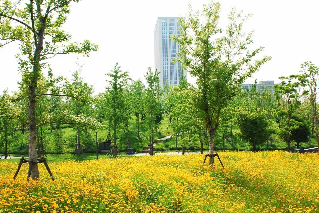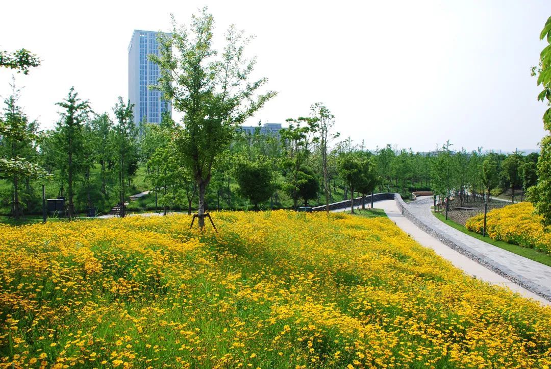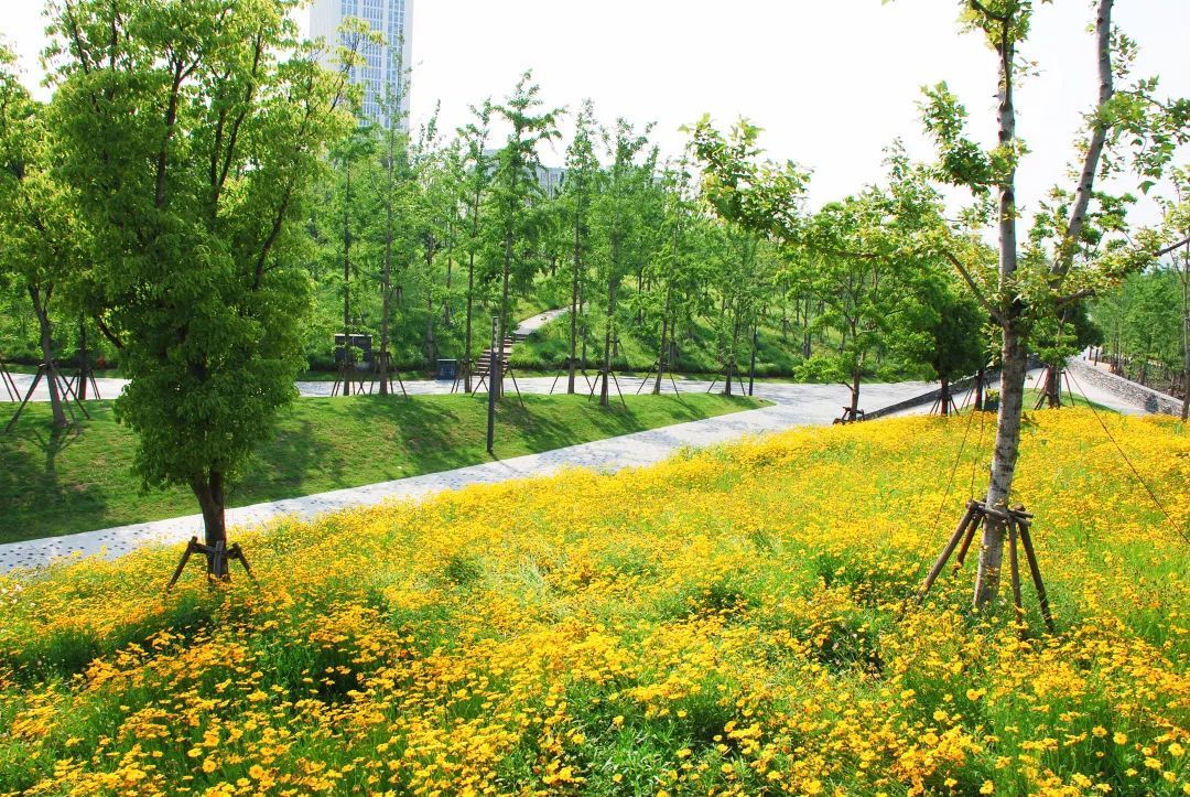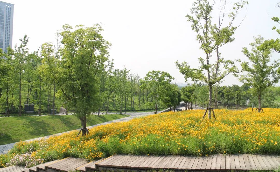 这三片花海呈现出金色、粉色、蓝色三种色调,形成了强烈的视觉冲击,带给游客们视觉享受,再配合周边其他花灌木的衬托,让游客们得到一种心情的释放。