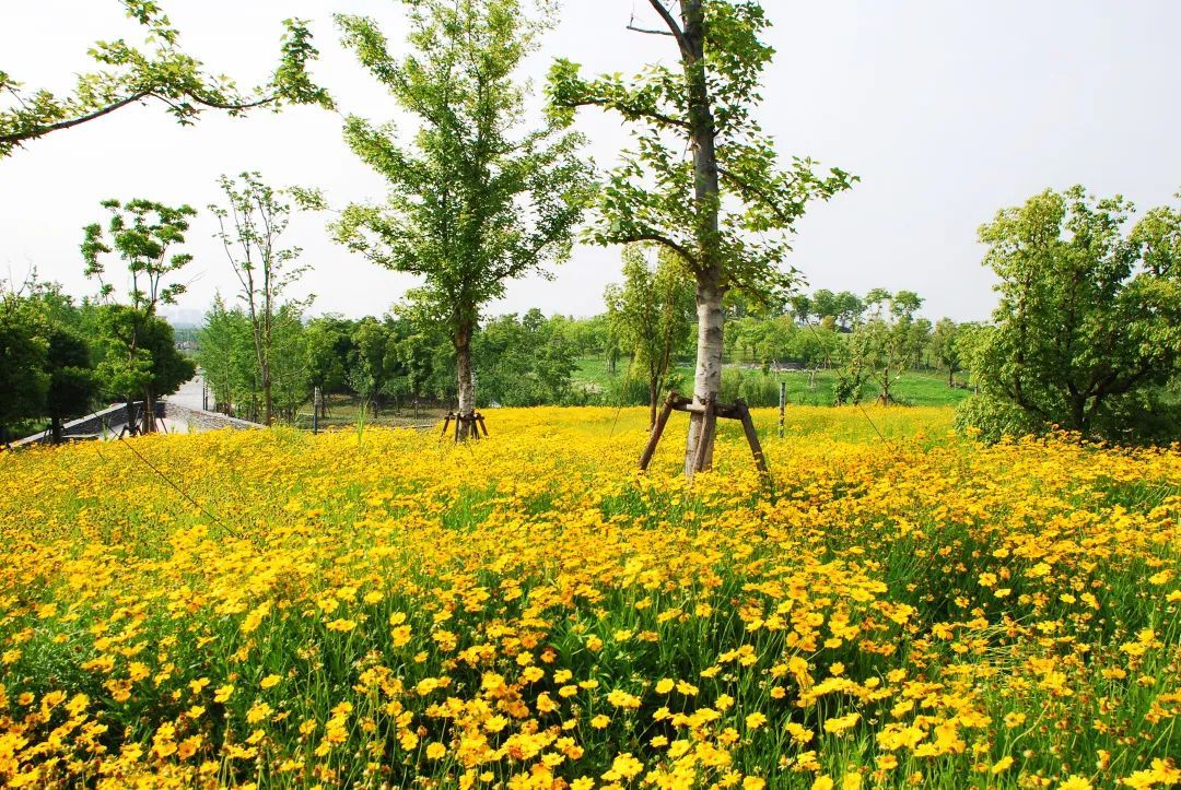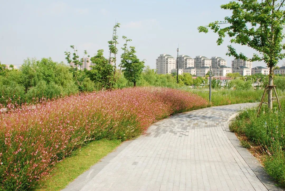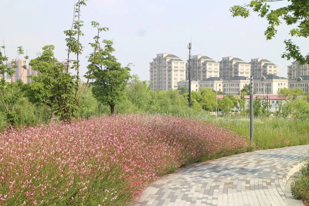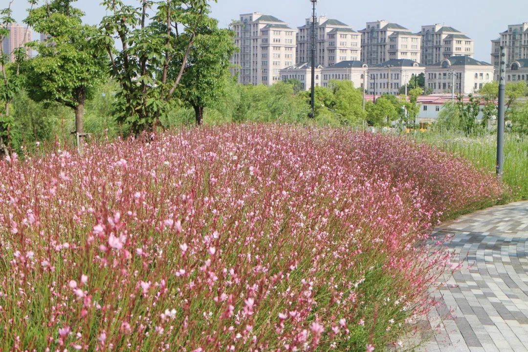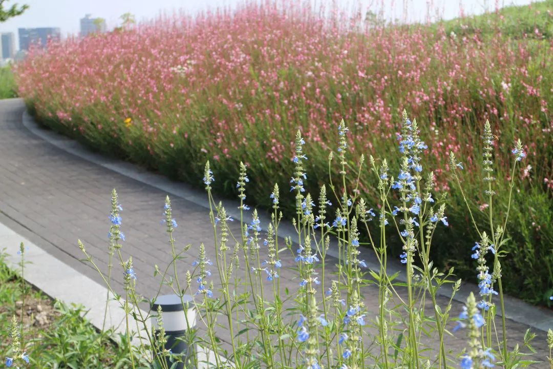桃浦中央绿地二标花海区域总占地面积6000平方米,主要种植宿根花卉品种,有金鸡菊、山桃草、鼠尾草、蓍草、福禄考、葱兰等地被植物,其中金鸡菊、山桃草、鼠尾草种植面积广,形成大片花海,在微风的吹动下,又像一浪接一浪的“花潮”。
