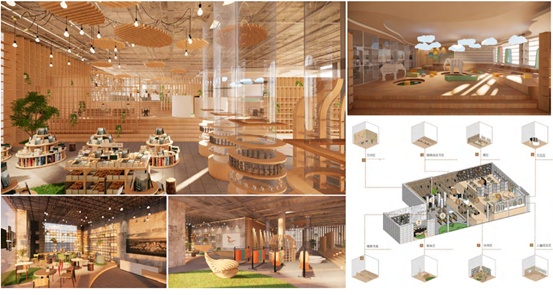 2021届毕业生吴佳怡 、钱子依的“cetacea·临港文创商业空间设计”,灵感就来自于学校所处的临港新片区。他们发现,临港地区目前缺乏能够体现城市的精神和形象的代表性建筑,于是,决定为临港设计一个涵盖文化交流、艺术交融的文创商业空间。“我们的设计理念围绕港城文化展开,运用了当下所流行的交互体验与绿色设计,并融入了体验式购物。”他们介绍,主体空间分为休闲区、服装区、文创区、楼梯阅读区、数字展厅以及儿童阅读区,注重空间的互动性、文化性、娱乐性及个性化,构建体验交互式的布局。