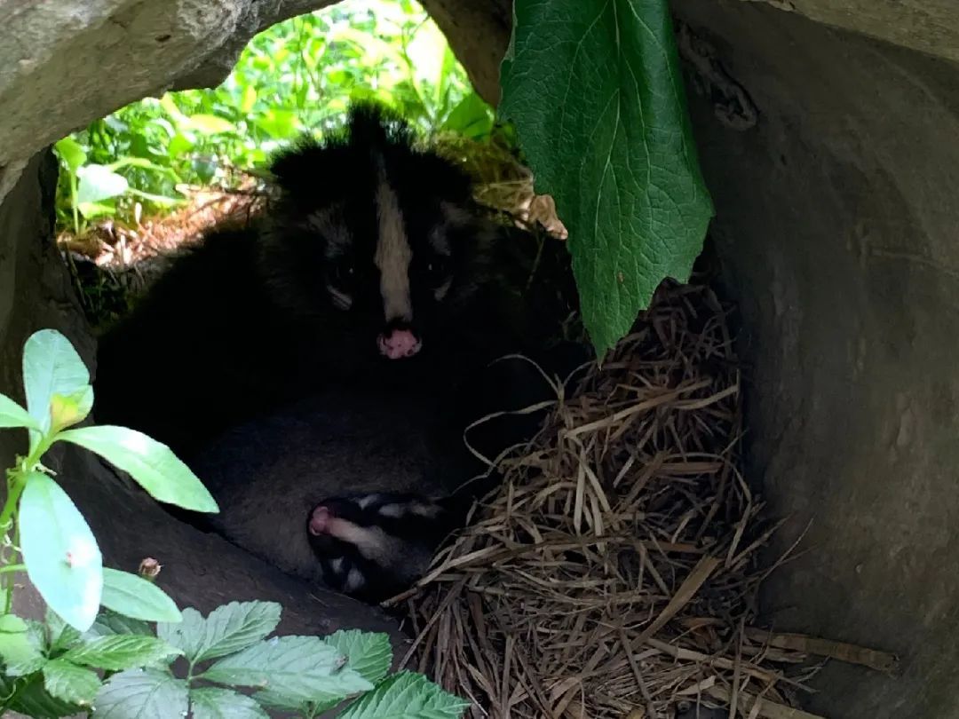 由于是第一次生产,果子狸妈妈十分小心谨慎,母性极强果子狸妈妈将幼崽紧紧地护在身边,时刻观察洞外的情况。