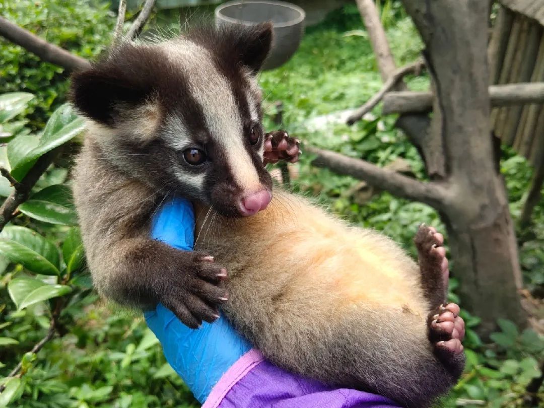 果子狸宝宝是4月底出生的,因此,5月26日,兽医院对已满1月龄的新生果子狸幼崽进行了驱虫工作。考虑到果子狸妈妈母性较强,可能存在护崽行为,兽医联合两名展区饲养员一同进入,并尽可能避免发出声响惊吓到它们,小心试探后将3只果子狸幼崽依次从树洞里抓出放入网袋防止逃跑,喂食驱虫药物后将其原样放回。