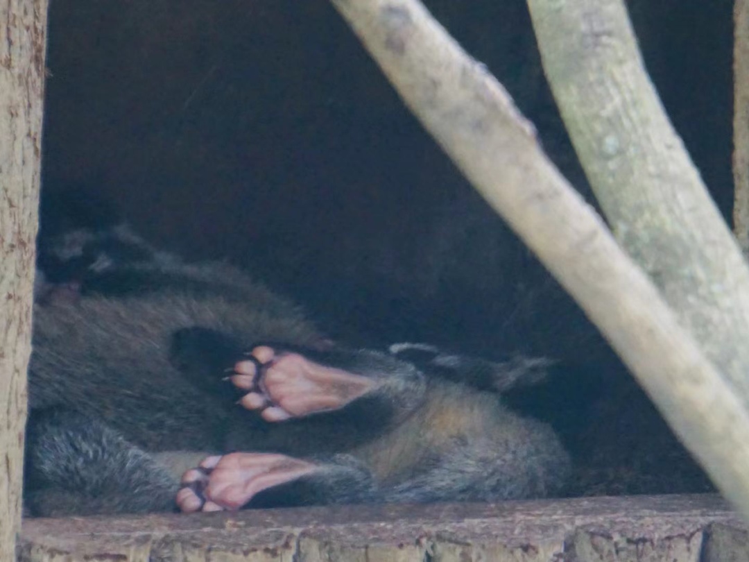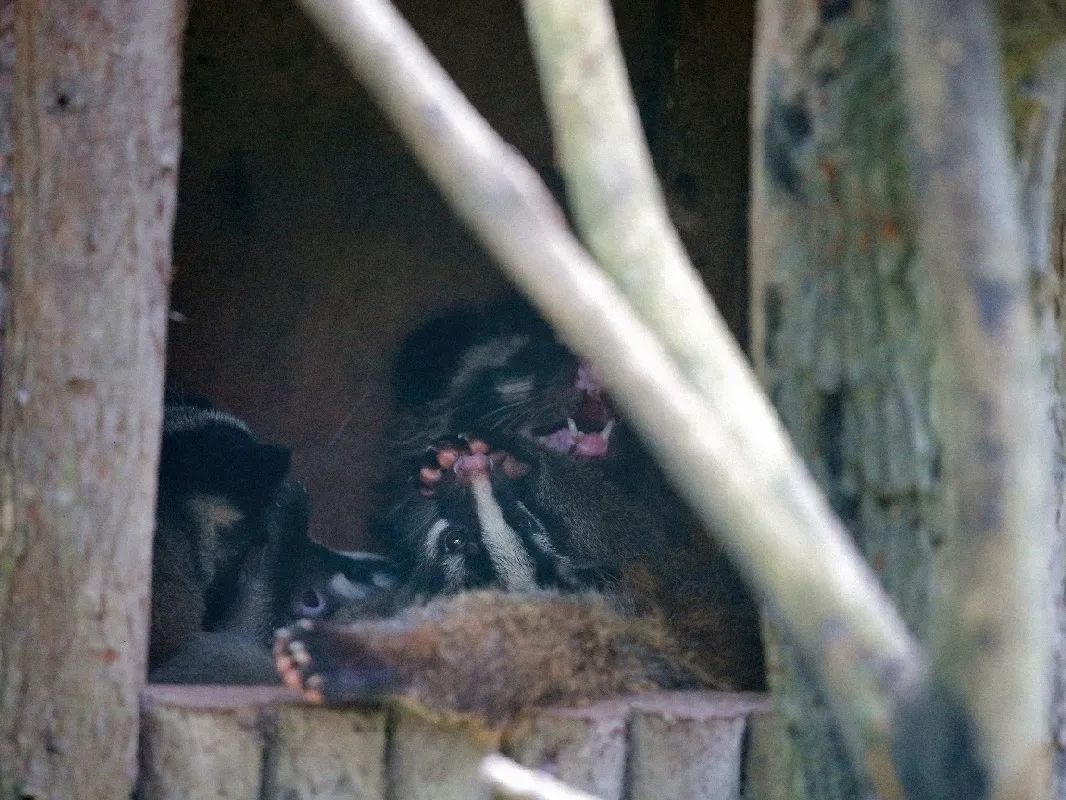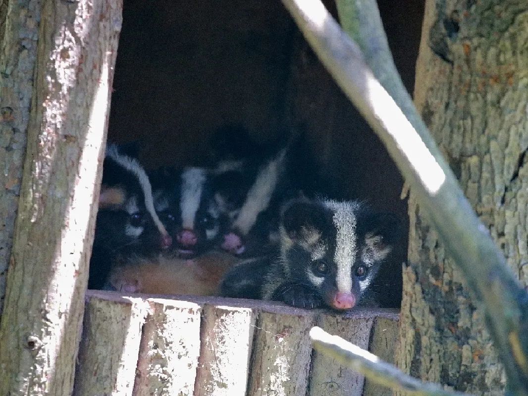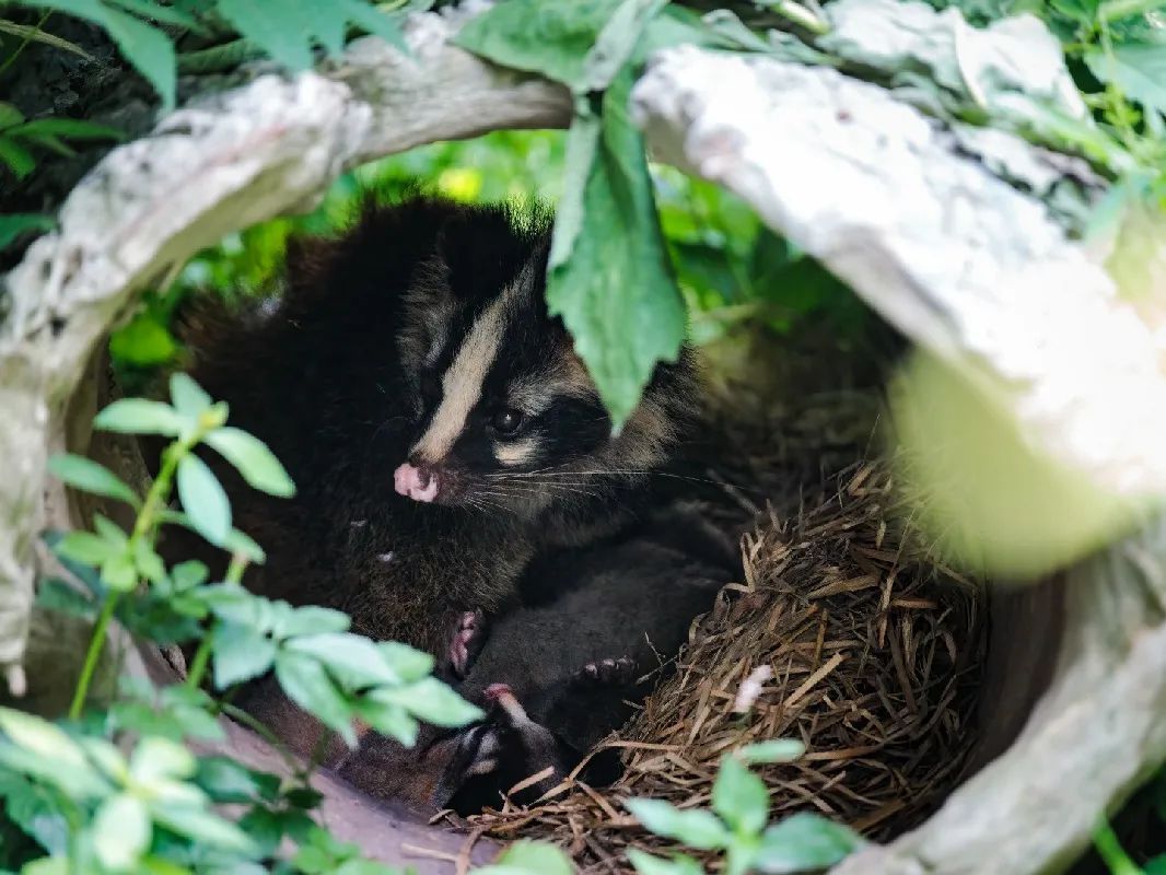 由于果子狸生活在亚热带常绿阔叶林和暖温带针阔混交林中,擅长爬树,白天躲在屋里乎乎大睡,所以它们大多选择在郁闭度大于40%树林,遮蔽物较多,便于躲藏和逃脱的地方居住。为了让果子狸一家住得好,展区内丰容植物茂密,饲养员也为果子狸备有“吉屋”好几处,统统都是精挑细选过的,往往位于阳坡,郁闭程度高,乔灌结合。宝宝们刚出生时,果子狸妈妈选择的是较为靠里,位于灌木丛中的一截树洞作为巢穴,遮蔽效果好,是产仔哺乳的良好环境。