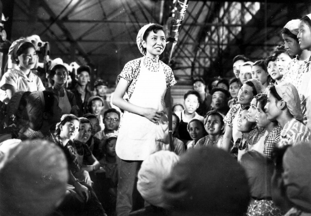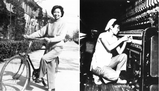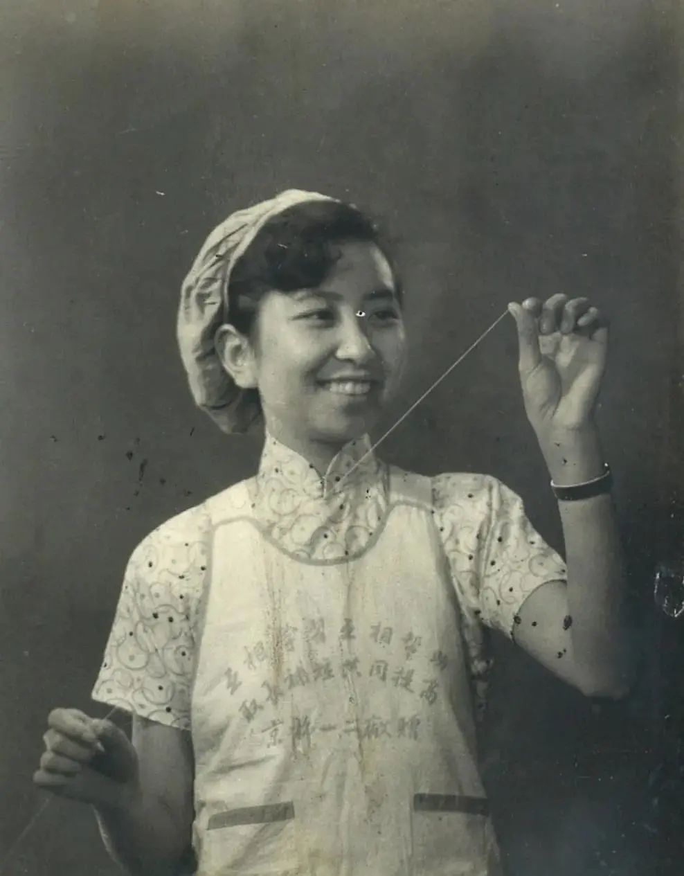 1958年,黄宝妹经刻苦钻研,掌握了“逐锭检修”技术(右)