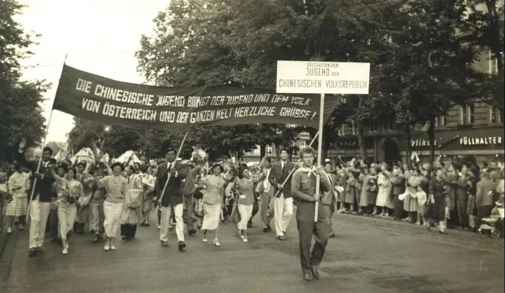 1959年,中国代表团参加维也纳世界青年联欢节和平游行情景(二排右 三为黄宝妹)