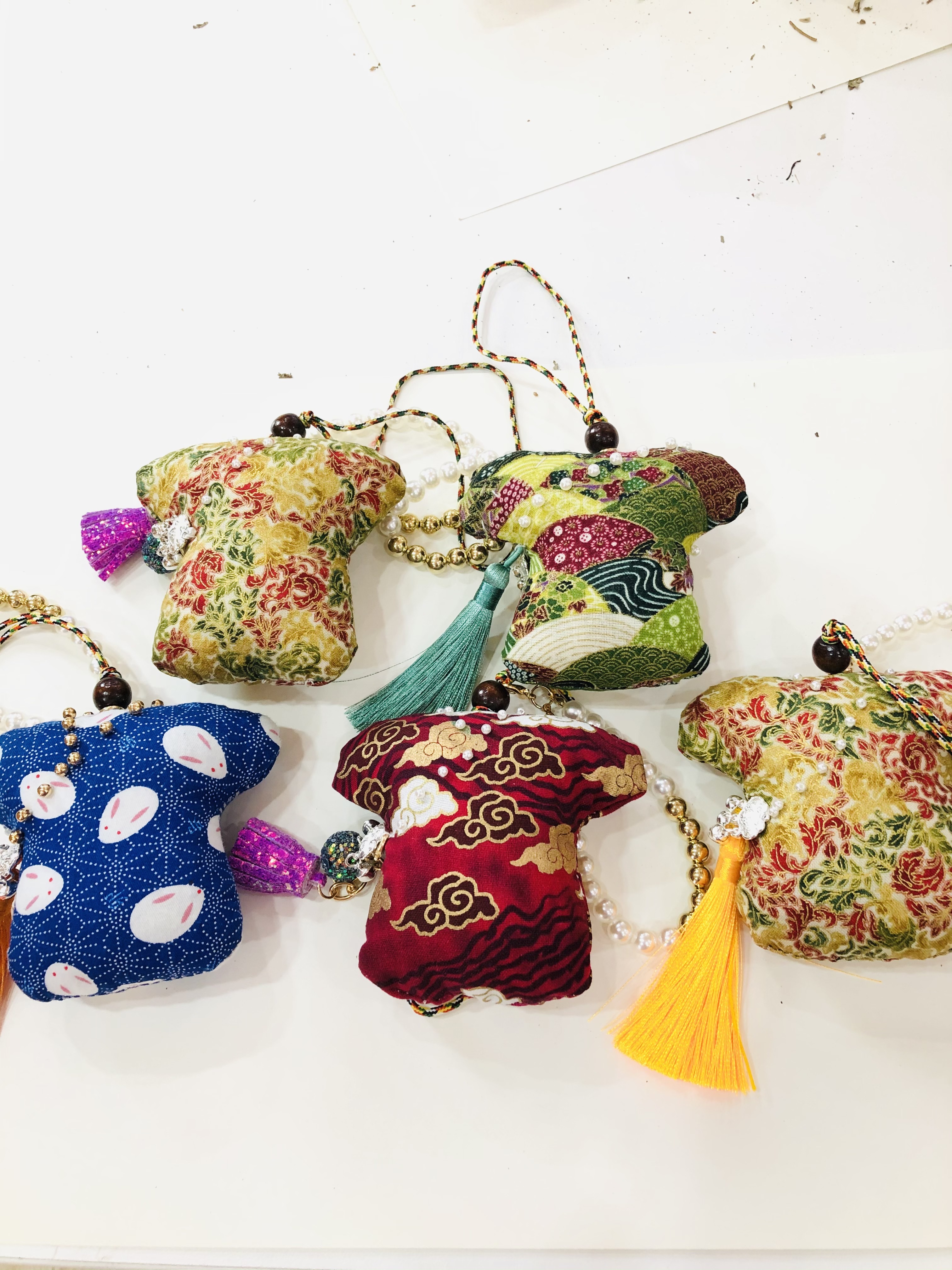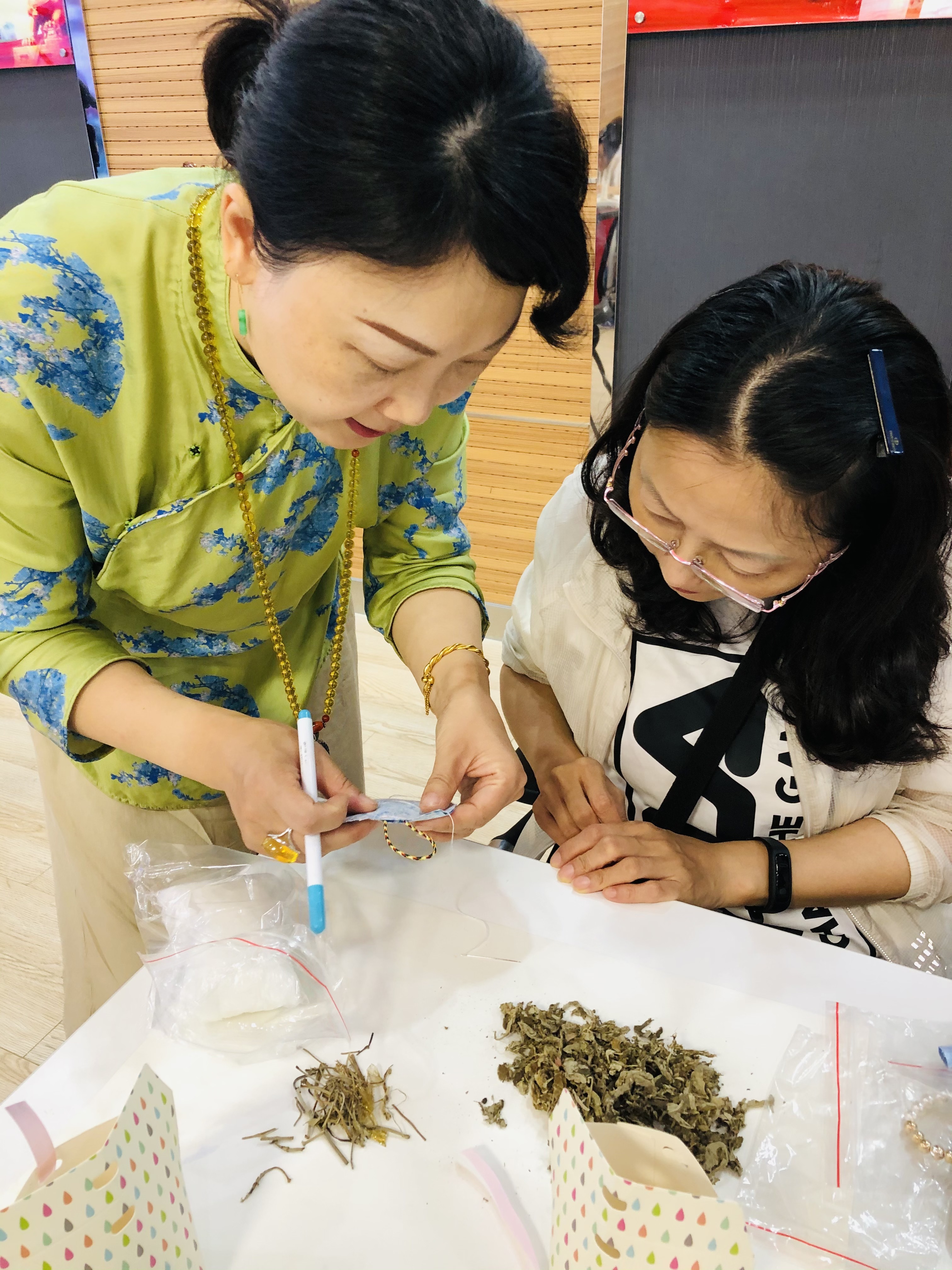 活动现场,大家的桌子上都摆满了花布、丝线、香料、珠子等各色制作材料。跟随着老师的细致讲解,参与者认真地完成穿针引线、放置香料、缝合香囊、系吊绳等制作步骤。很快,一个个色彩斑斓、样式各异的香囊就在手中诞生。