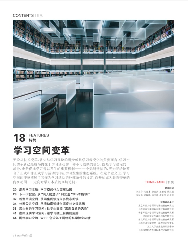 本期《上海教育·环球教育时讯》“特稿”栏目聚焦学习空间变革,揭示学习空间变革的动因和趋势,呈现多元化的包括“下一代”教室、阅读空间、校园公共空间、亲生物学习空间、网络空间以及虚拟现实学习空间在内的新型学习空间案例。