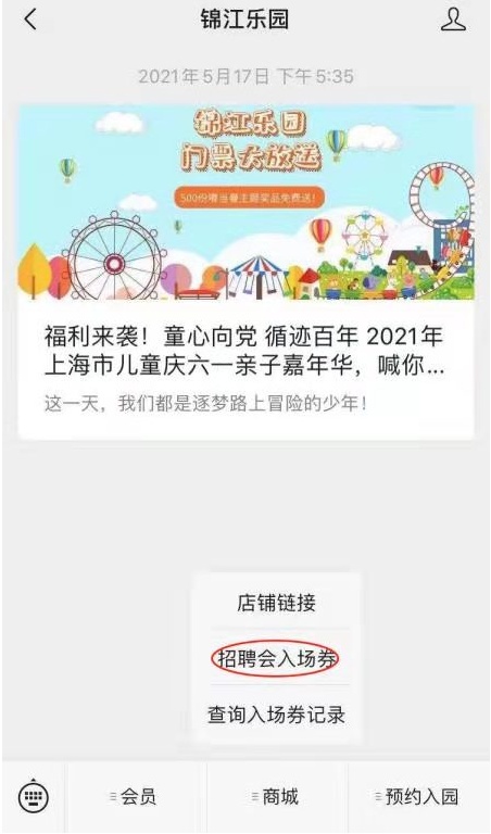 请在“锦江乐园”微信公众号进行招聘会入场券预约登记