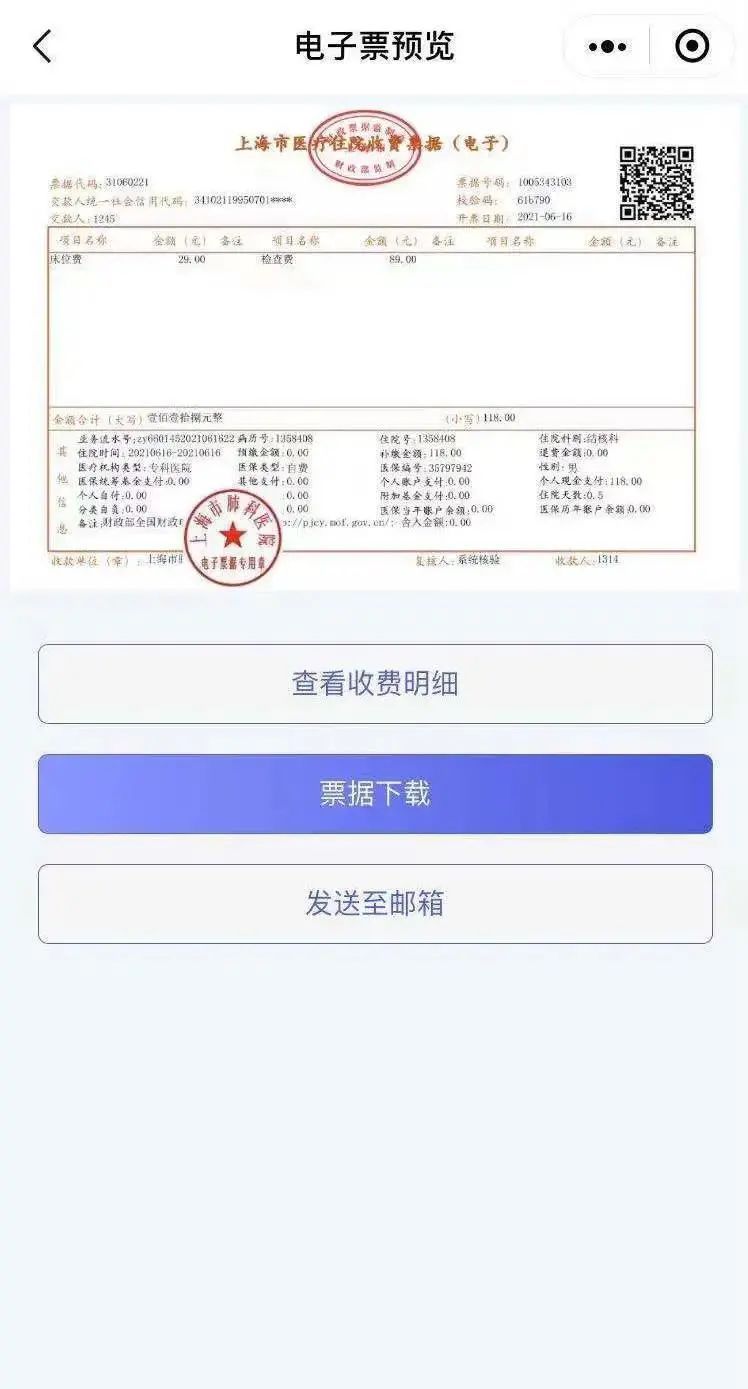 ps:长按票据界面即可保存电子票据至手机相册,点击“票据下载”即可获得电子票据及收费明细的下载地址。