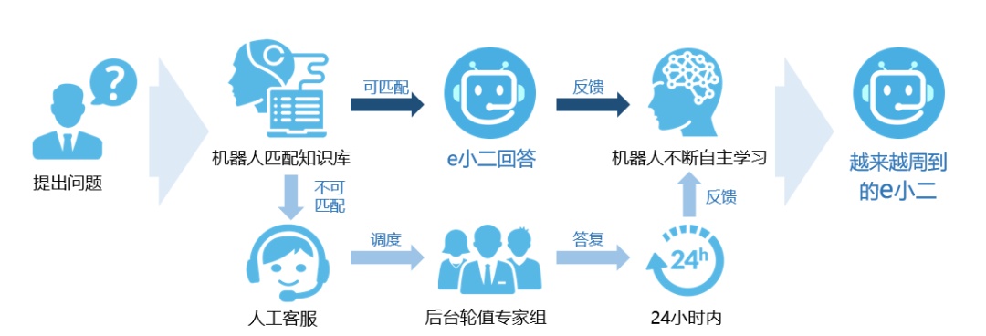 企业服务专属机器人e小二,通过机器学习的技术手段,构建了覆盖环评、排污许可、辐射环境安全、固体废物管理、环境应急、碳排放、土壤污染防治、环保设施运营管理等8大领域环保知识库,为广大社会主体(企事业单位)提供免费的生态环境保护专业咨询服务,提供相关业务的便捷办理入口。若机器人无法解答,则引入线下专家答复机制。