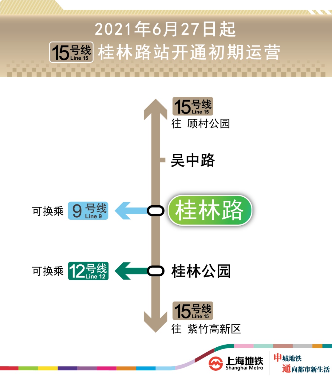 申通地铁集团说,轨道交通15号线桂林路站将于6月27日(本周日)首班车起开通初期运营。届时,772公里的上海轨道交通运营网络中(含磁浮),车站数将增至460座,换乘站增至65座。