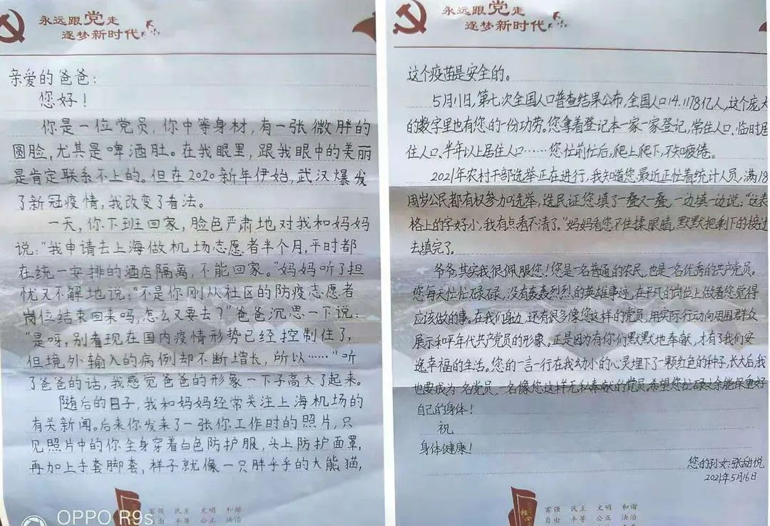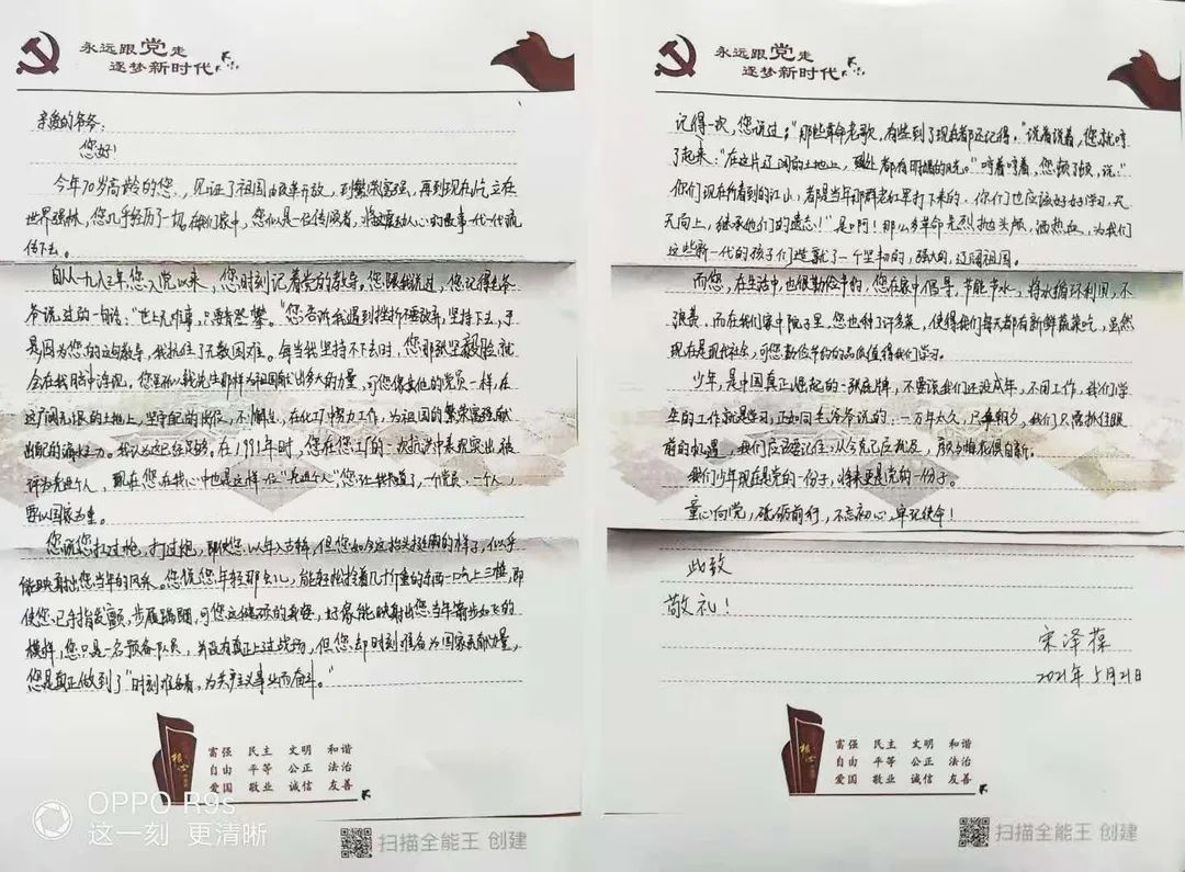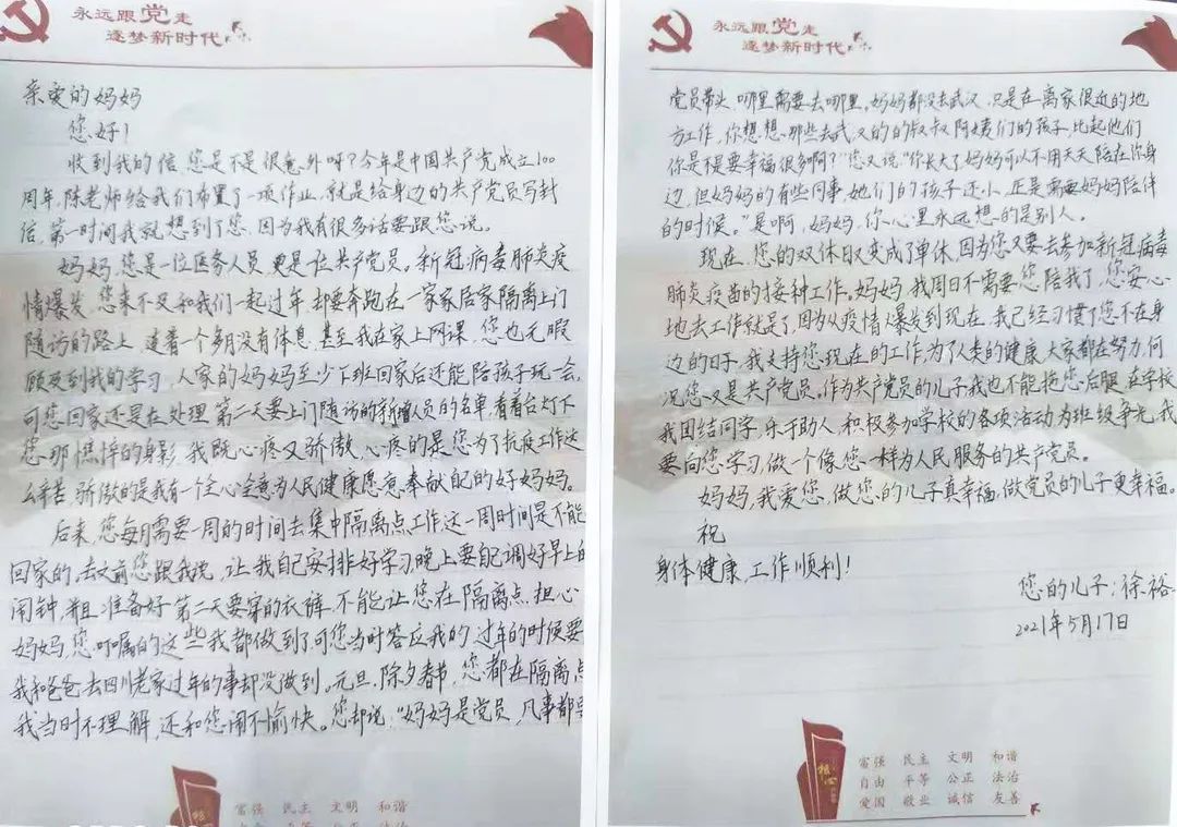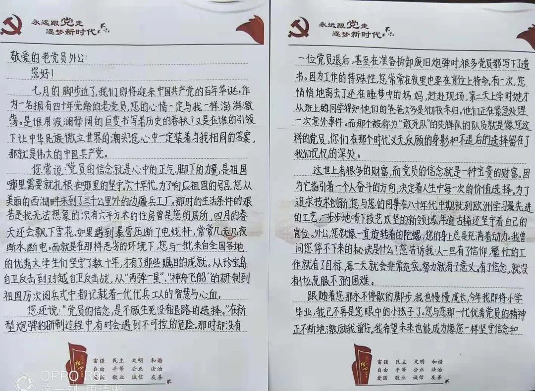 传承书信文化,发扬党员精神。同学们纷纷给身边的共产党员写信,表达出在中国共产党的领导下,幸福成长在党旗下,目睹中国发生了巨大的成就,传颂身边党员的先锋模范事,坚定了永远跟党走决心。