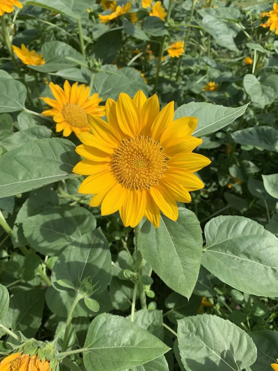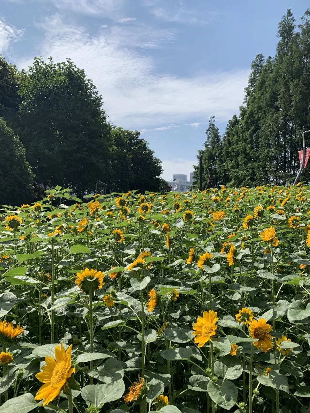 本次南园滨江公园分别种植了 “金富贵”、“无限阳光”两个品种的向日葵,种植面积为1815平方米,中心花坛种植共计7100株。其茎杆上嫩绿色的叶片相对而生,花瓣内有多个花蕊,在风中挺着摇曳的身姿,无论阳光多么刺眼,也绝不改变“初心”,时刻朝着阳光茁壮成长。