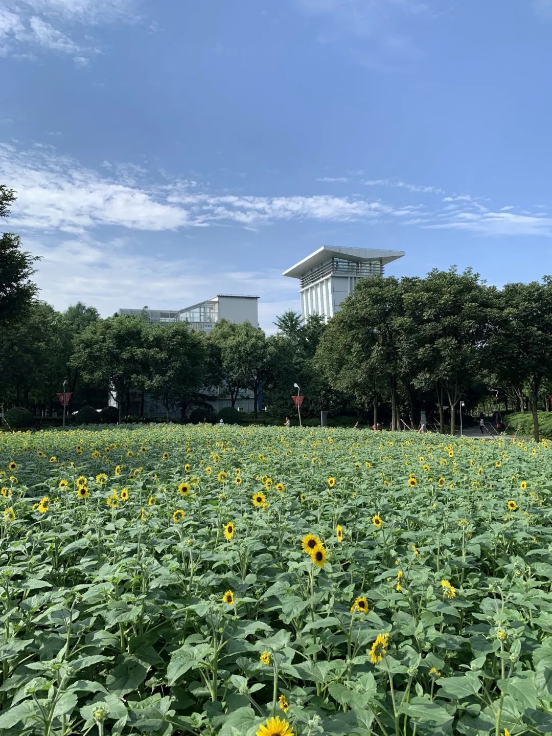 园内金色的花海,在蓝天下蔚为壮观,面向骄阳,热情奔放。它们昂首挺胸,以最美的花容与姿态迎接着四方宾客来此驻足观赏,拍照留念。