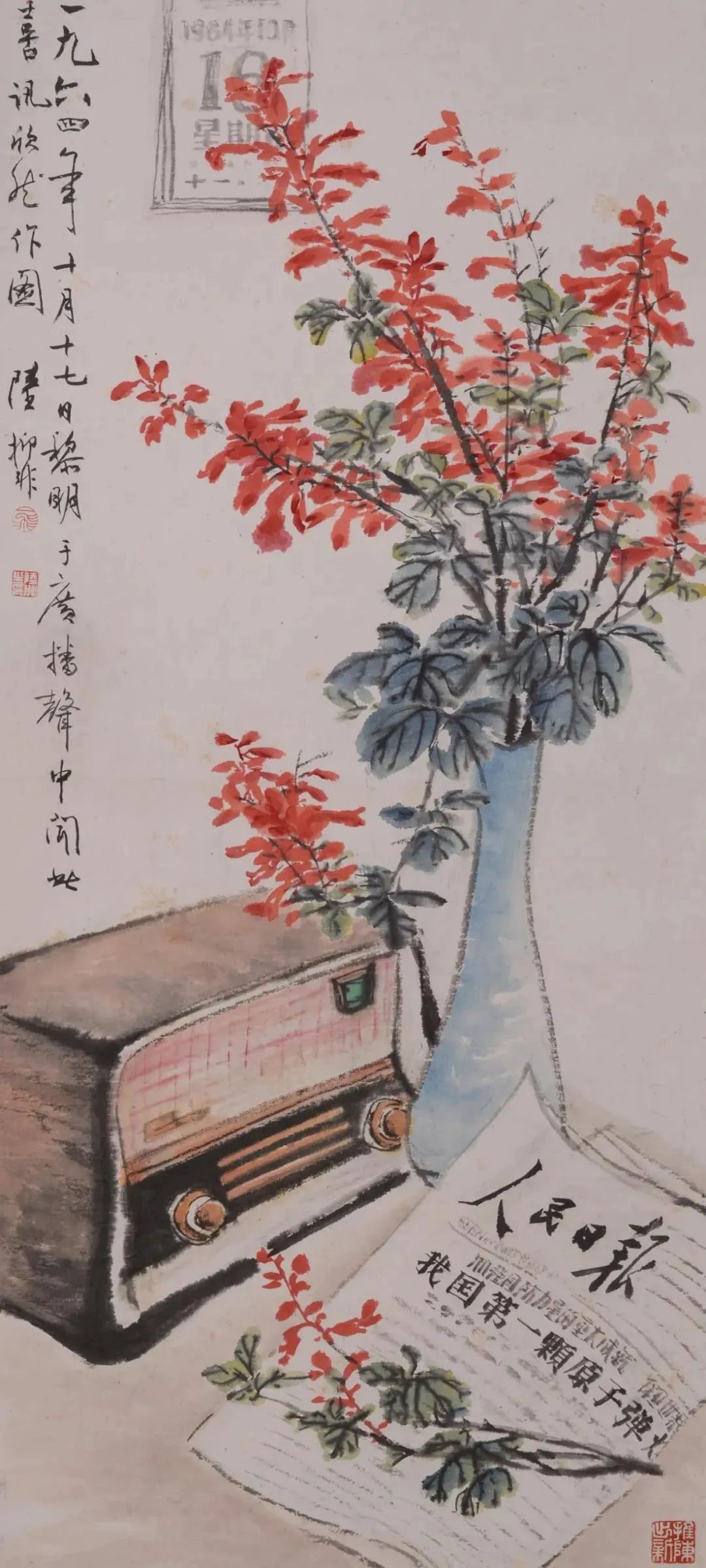 除了吴湖帆之外,其弟子,花鸟画大家陆抑非先生也画了一张《喜庆中国第一颗原子弹爆炸成功》。此图并未直接描绘原子弹爆炸的场景,而是通过日历、收音机、花卉、报纸等几个物象的组合表现出我国原子弹爆炸成功的消息已传遍万家。墙上的日历,恰好翻到了10月16日;老式收音机意味着原子弹爆炸成功的消息已传入百姓家。一张《人民日报》放于桌上,标题“我国第一颗原子弹爆炸”十分醒目。此外,花瓶中所插的一串红,更寓意着喜庆的意味与热烈的情感。题跋曰:“一九六四年十月十七日黎明,于广播声中闻此喜讯欣然作图,陆抑非。”更可知,此图是在原子弹爆炸后消息传遍全国的第一时间所作的。