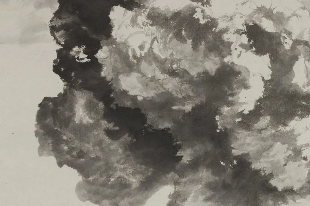 蘑菇云的暗部以大块的水墨点厾烘染而成