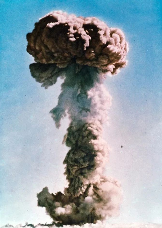 1964年10月16日,我国第一颗原子弹在罗布泊爆炸成功。为了庆祝此事,不少书画家都用书画作品进行歌颂。其中,吴湖帆作于1965年的《庆祝我国原子弹爆炸成功》是一件较有代表性的作品。