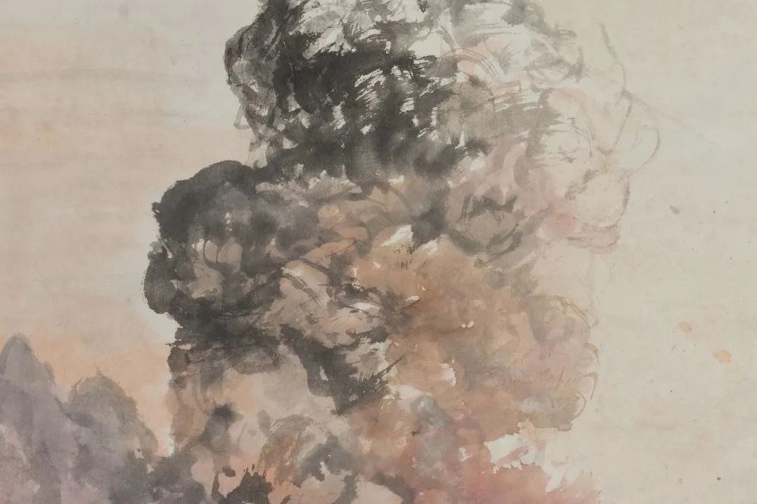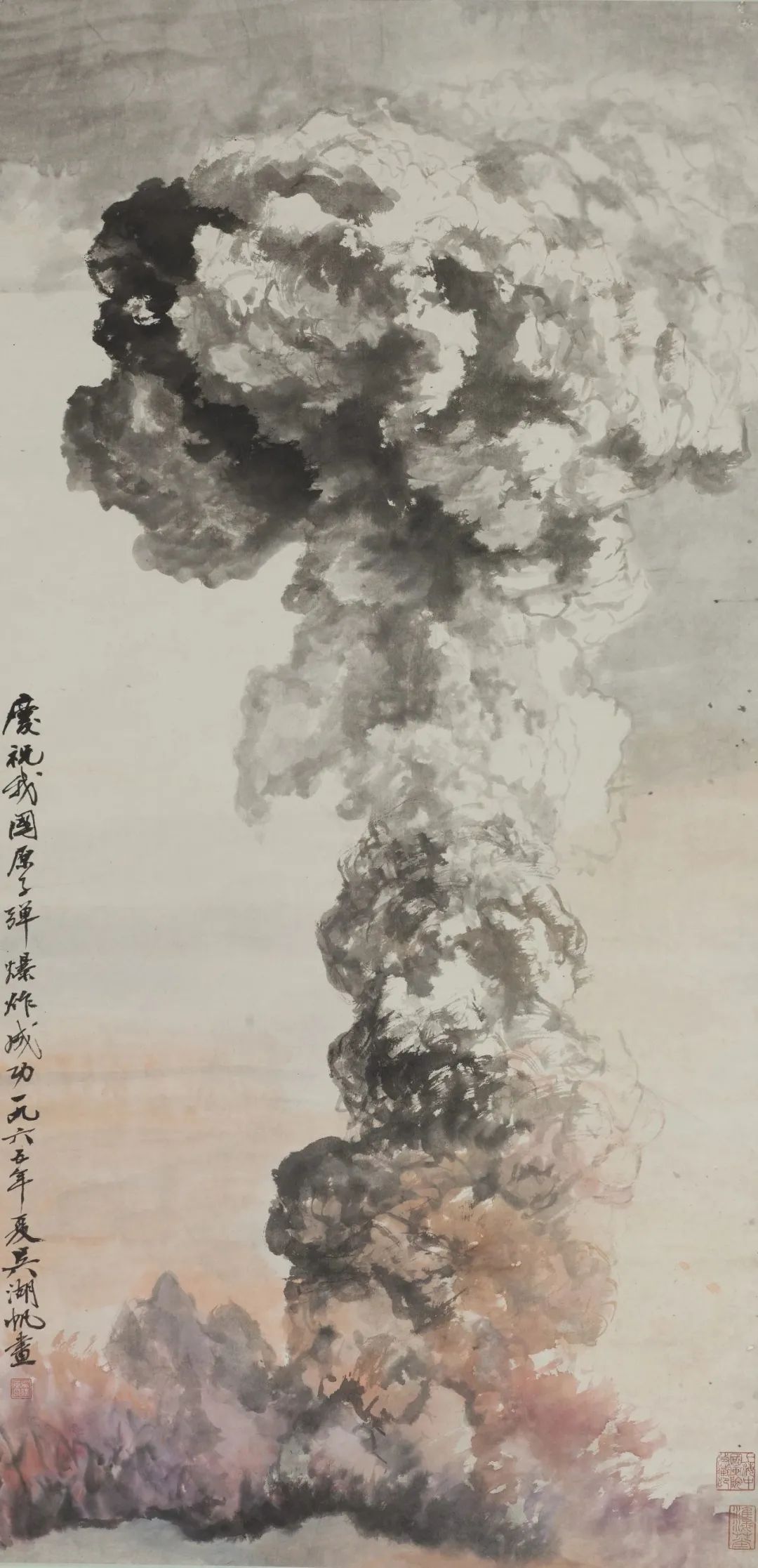 此图作于1965年夏日,在创作之前,吴湖帆反复观看报纸上刊登的由孟昭瑞拍摄的《我国第一颗原子弹爆炸成功》照片,又观摩过原子弹爆炸的记录片,遂以传统山水画中描绘云烟的烘染技法表现翻滚上升的蘑菇云。