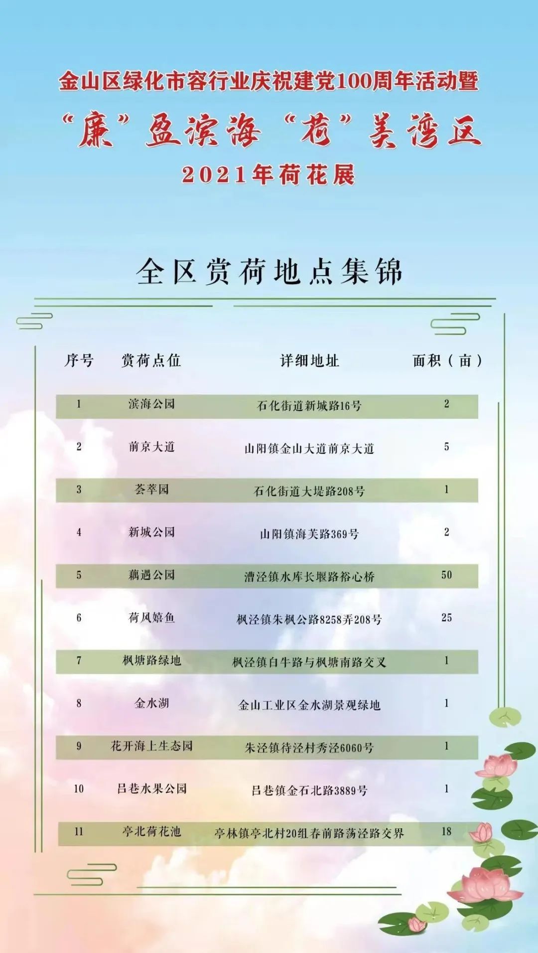 此次活动中,滨海公园是主会场,金山区其他10个点位还设立分会场,赏荷面积共达到107亩。