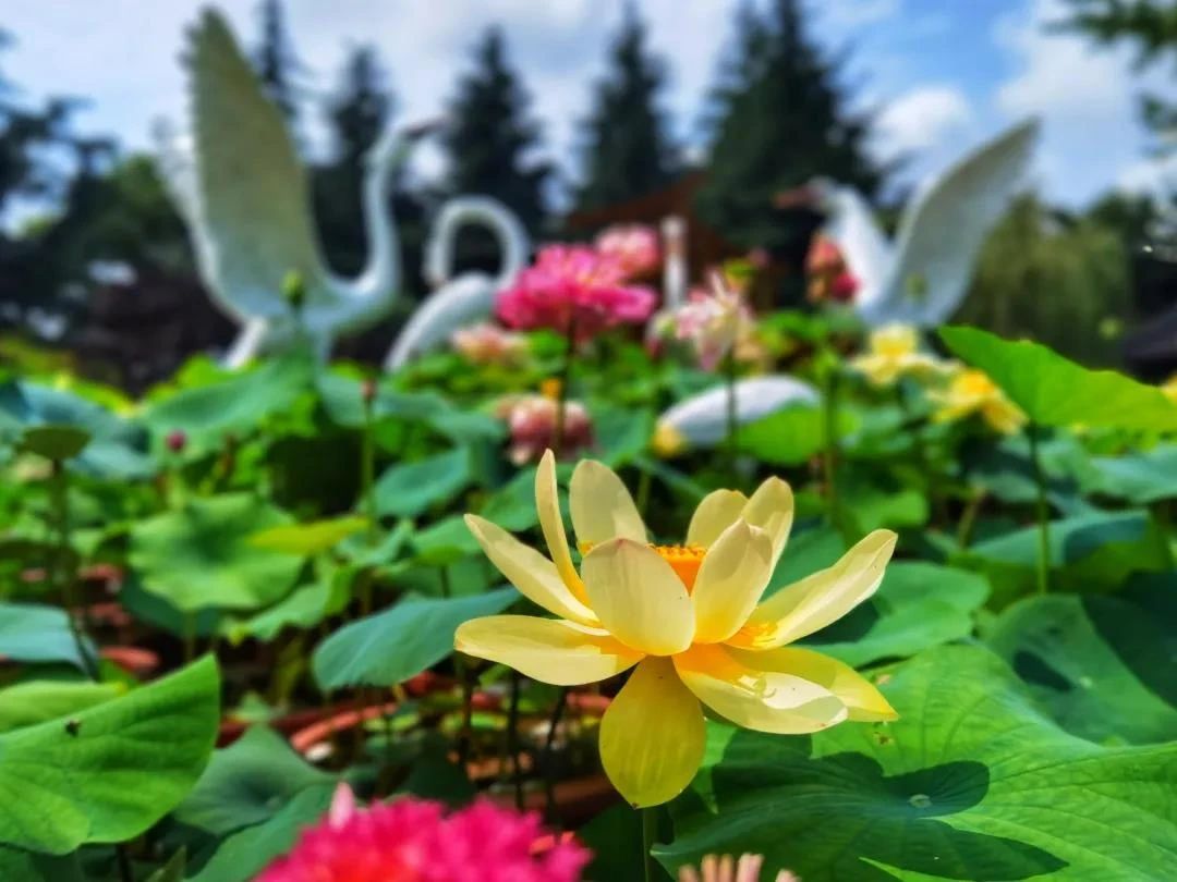 2021滨海公园荷花展已开幕,前往公园的市民可尽情欣赏1000多平方米的塘栽荷花和造型别致的缸栽荷花,在炎炎夏日里享受清凉与美景。此次荷花展中的景观小品融入了党徽、红星、长征等元素,与各色荷花相互映衬。