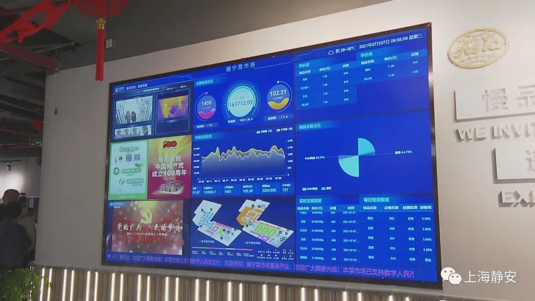 入口处的一块智能化信息数据屏上,每日检测数据、实时交易数据统计、市场交易走势、市场每日交易额等信息都被显示在上面。