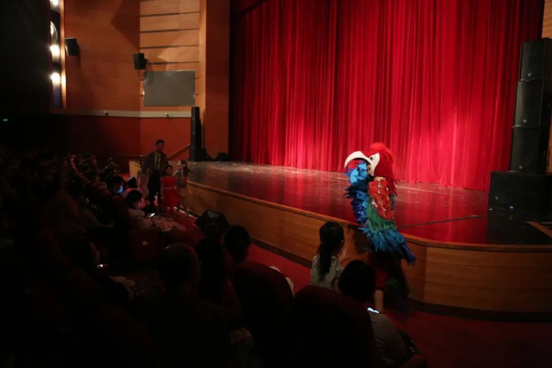 观演过程中,小朋友们不仅和演员们一同找寻王子,有的还被邀请上台与演员即时互动。在台下和孩子一同观看的家长李皎表示,“演出时小鹦鹉下台来被追着满场跑,现场气氛马上就被调动起来了。”
