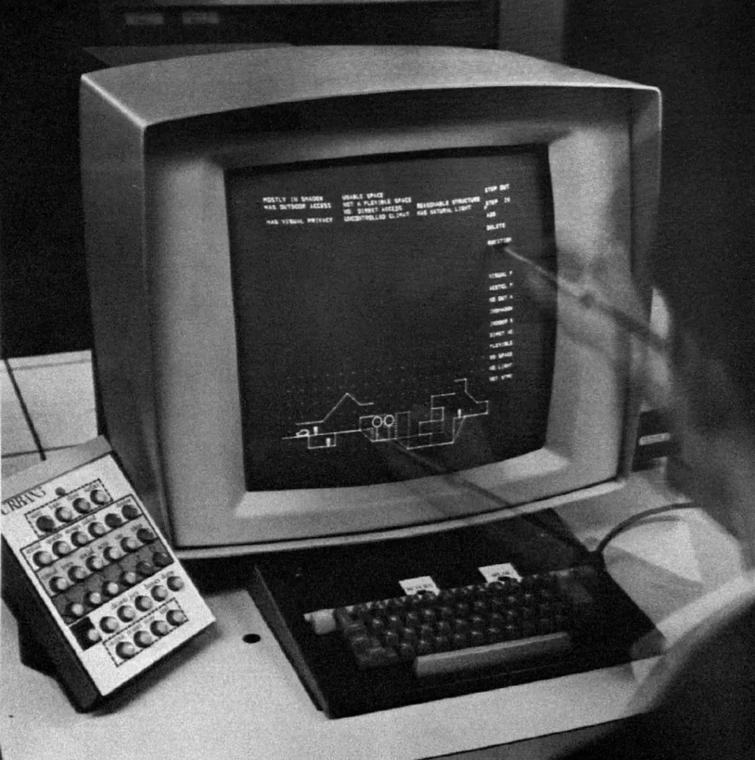 urban5 是一个诞生于1970年代的城市设计系统,用户可以使用光笔在屏幕上绘制方块并输入属性。在用户完成前述步骤后,urban5会根据系统内置的问题与人类用户进行交互式的对话以推进设计。