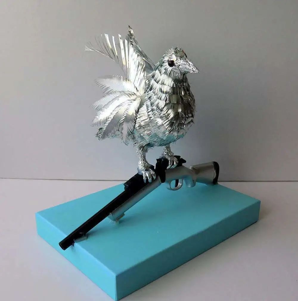 “和平如果没有实力作为基础,只能是空中楼阁。我采用易拉罐、塑料、纸盒等综合材料制作制作了《守护和平》这件雕塑作品,来展示刚强之美,弘扬和平精神。我的和平鸽一改往日白鸽的形象,用厚薄不一的铝箔分别制作它的绒毛和羽毛,使其散发着金属光泽。有力的爪子折断代表战争的“枪”。这样一个刚强的和平使者的形象,才是永无战争的有力保障!”