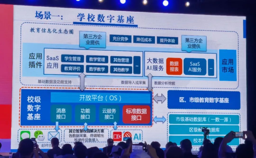 橙色这块是校级的,主要内容是学校数字基座和校本数据库,在此基础上企业将为整个教育生态提供各种第三方服务和生态建设的支撑。