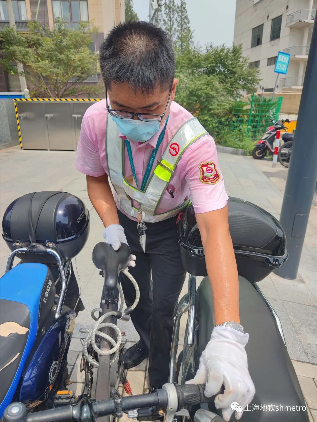 下午16:30,18号线御桥路站职工顶着酷暑,为保持出入口通道畅通,一天之中数次将站外占道的非机动车挪到指定停放位置,确保乘客出行舒适便捷。