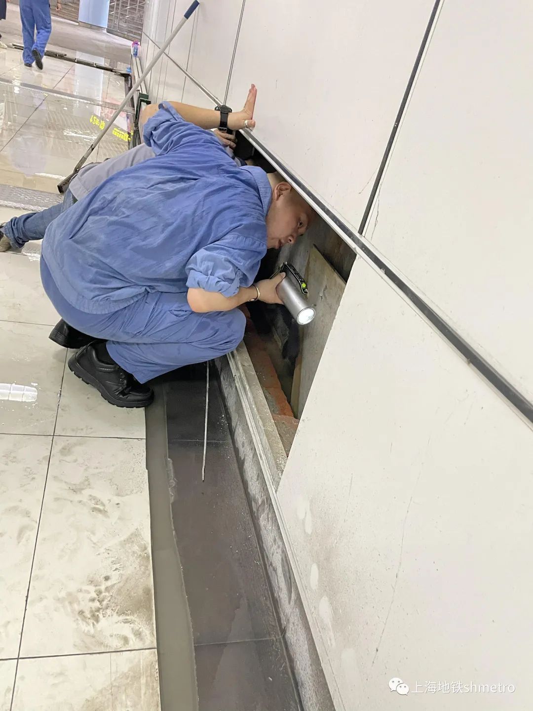 晚上23:00,4号线检修班组正打开墙体装饰板检查墙面结构