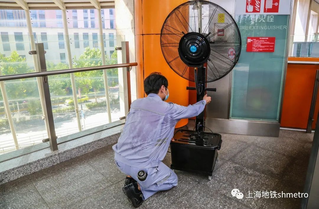 上午8:00,为确保乘客候车舒适度,11号线设备人员清洗调试户外风扇,确保夏季运行正常。