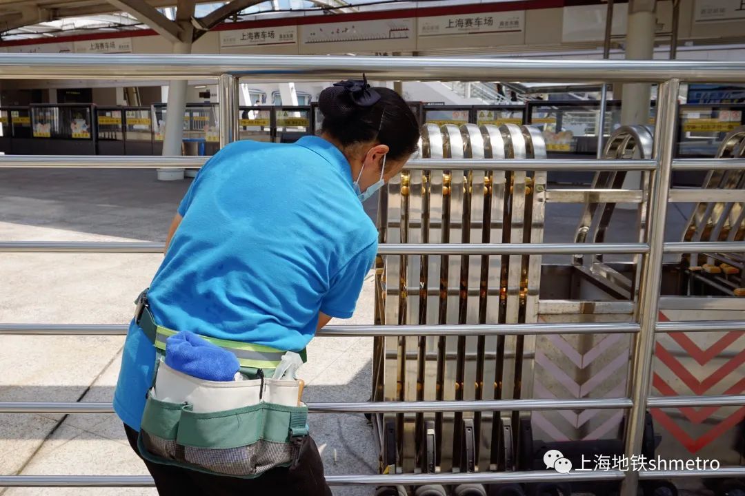 下午13:30,在11号线上海赛车场站,保洁员在阳光直射的户外工作,为了做好防疫消杀,都必须带二层手套。