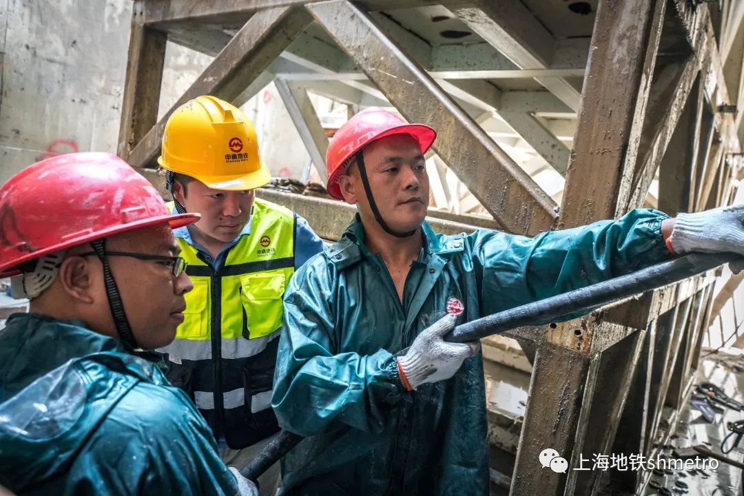 下午14:00,14号线项目公司项目经理吴东鹏在酷暑烈日下深入基坑与施工人员一起检查武定路站“束合管幕”工程施工情况。