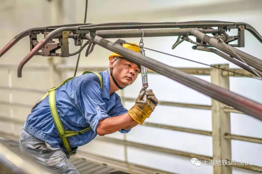 上午9:30,地铁基地内,地铁车辆检修人员迎着高温,在接近50℃车顶更换受电弓,保障地铁列车安全运营。