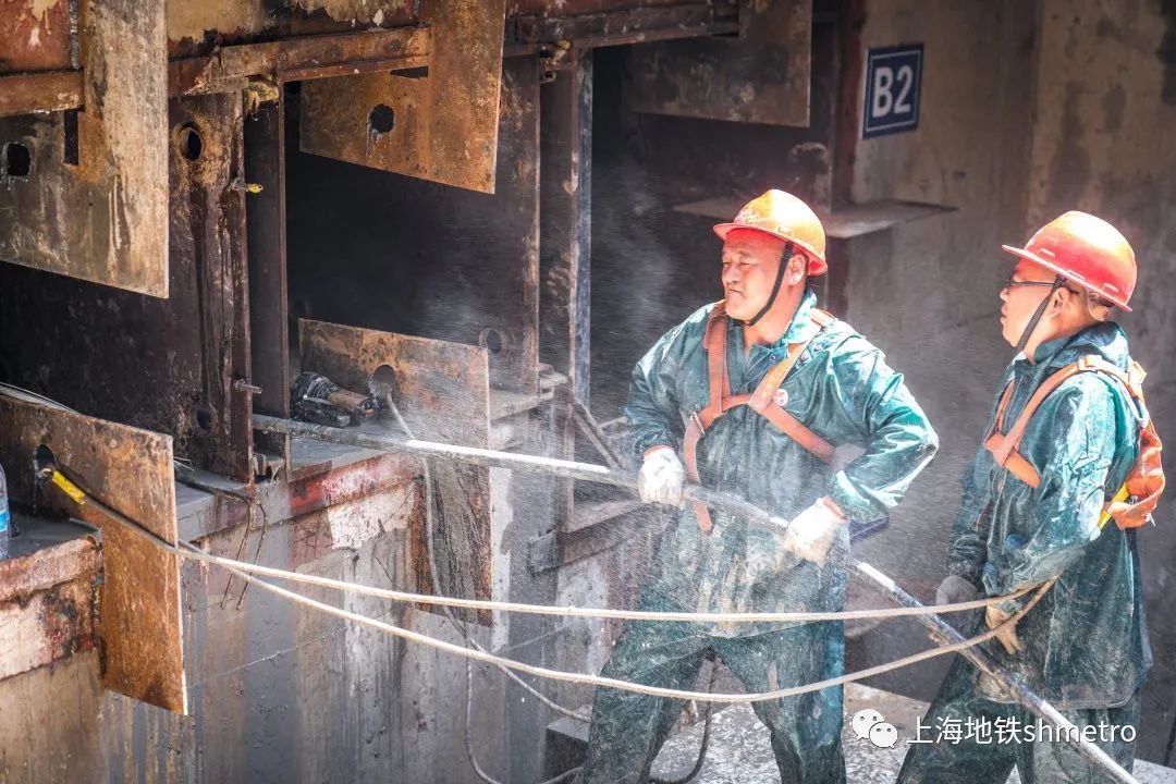 下午15:00,14号线武定路站,李洪军、李建两位工人师傅在烈日下对1号出入口束合管幕的24个拼缝进行冲水清洁,确保后道工序顺利推进。