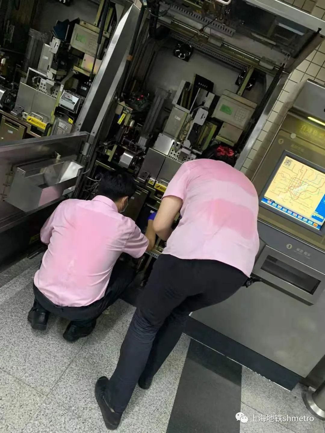 晚上20:00,每天晚高峰后,3号线虹桥路站值班站长和站务员打开自动售票机进行票卡回收和加值作业。