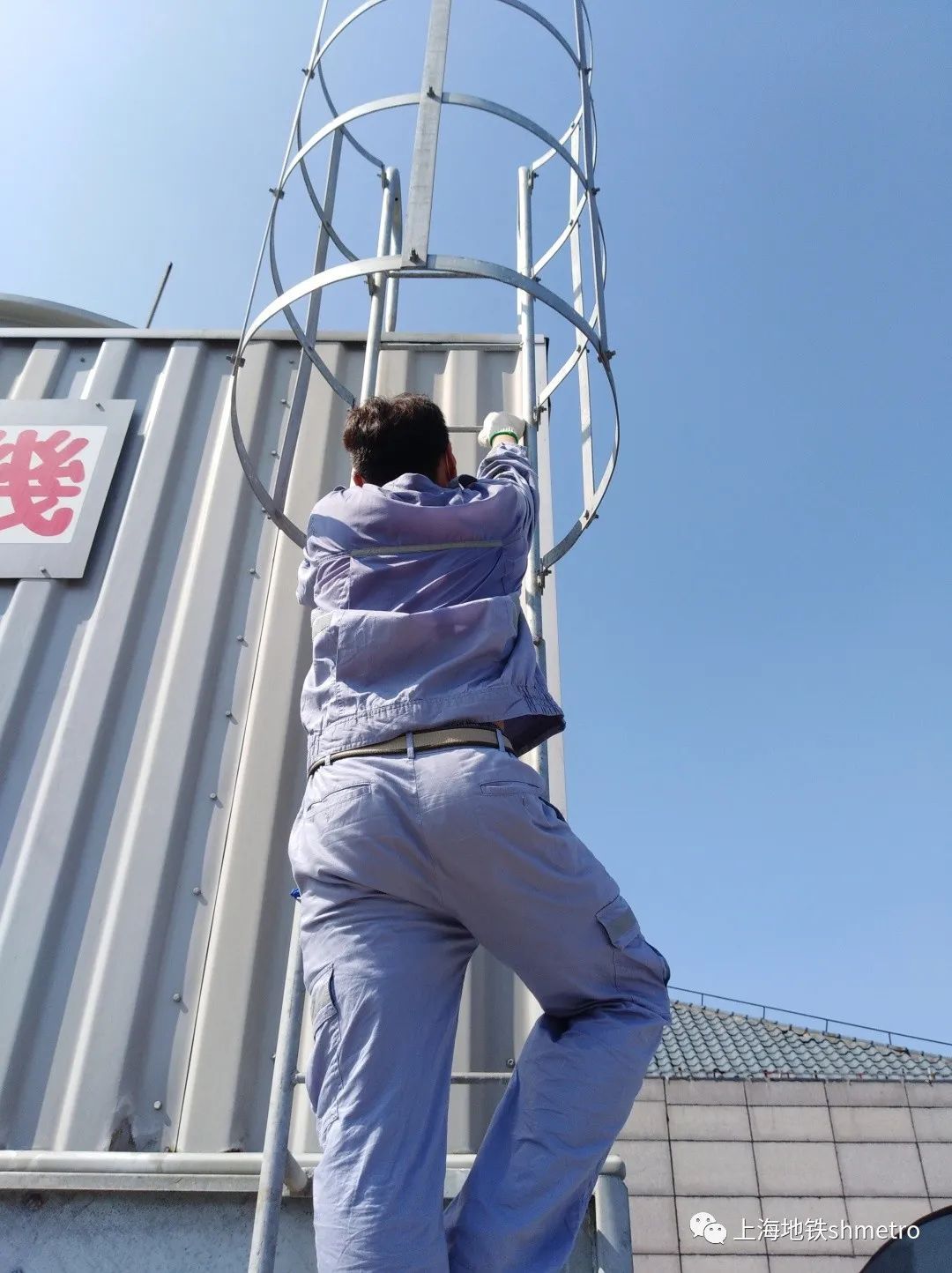 上午8:30,为保证车站冷水机组运行,9号线检修人员检查户外冷却塔。