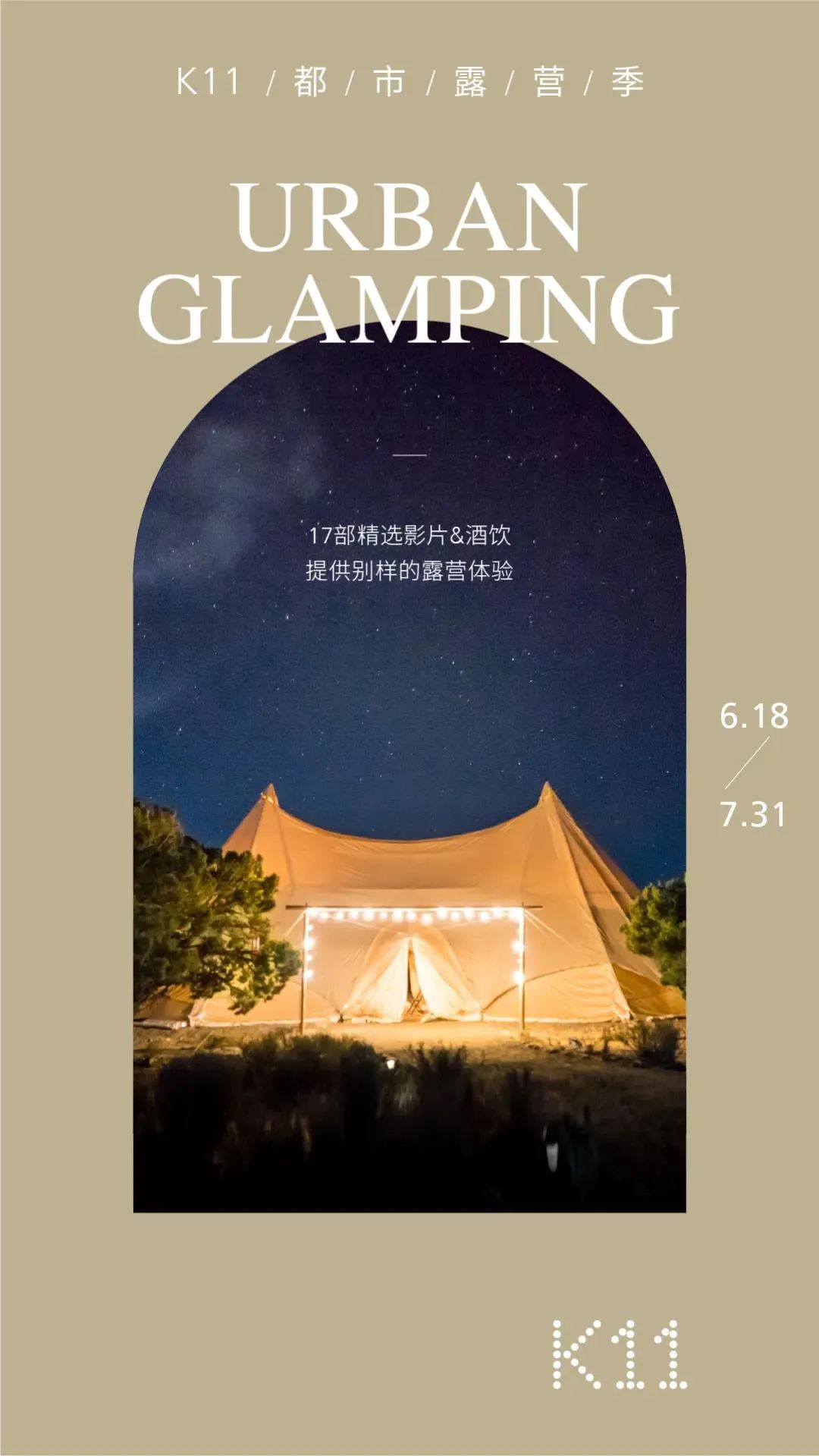 即日起至7月31日,k11限时开启星空营地露天影院,并连轴放映包括《我只认识你》《自行车与旧电钢》《城市梦》等17 部华语佳片。夜幕降临之时,和好友一起坐在都市露营地,观赏淮海路的繁华夜景,欣赏露天电影,氛围感十足!
