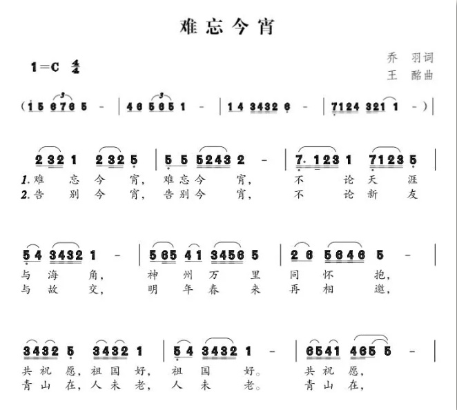 1984年,中央电视台春节联欢晚会总导演黄一鹤觉得缺少一首与整台节目相配合的歌曲,于是找到了词作家乔羽,希望他能为当年春晚的结尾曲写一下歌词,内容要有家人团聚,祖国大团圆,亲人间的骨肉之情和对未来的希望。乔羽当晚就写出了歌词,随后,黄一鹤找来作曲家王酩谱曲,李谷一演唱,这便是之后传遍大江南北的歌曲《难忘今宵》。