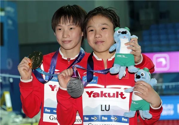 2019年,在韩国光州举行的世锦赛上,陈芋汐(左)与队友卢为包揽冠亚军