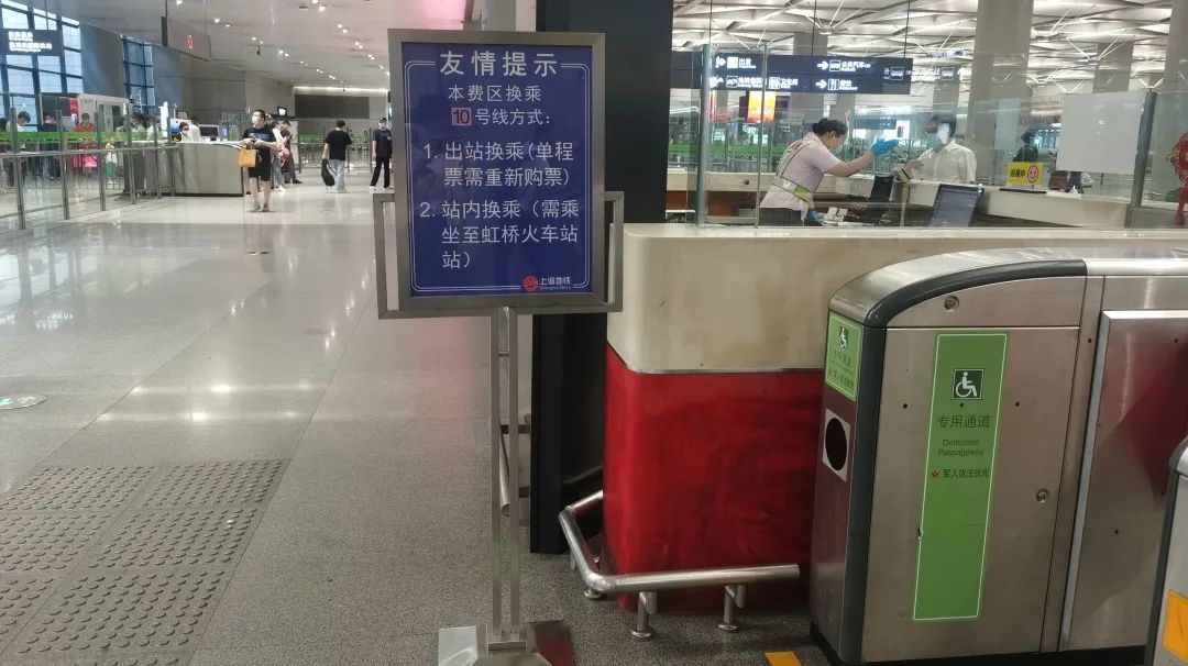 分别在2号线以及10号线站厅出站闸机处各设置移动导向牌,蓝底白字字体醒目。友情提示持单程票的乘客出站换乘需重新购票,如需站内换乘可坐至虹桥火车站,确保乘客在插卡出站前就可看到此提示,方便出行。