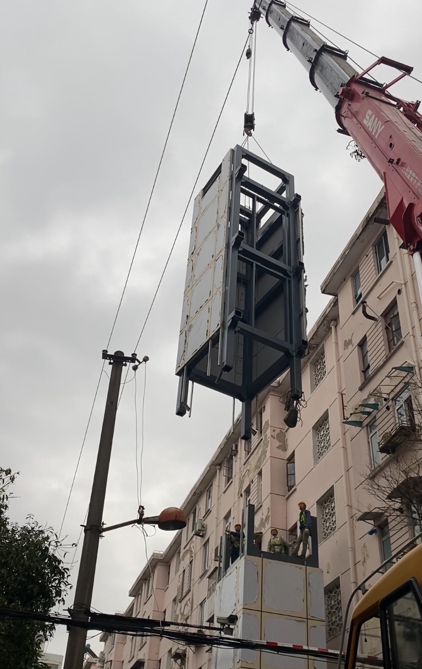 与此同时,区别于以往加梯施工需要搭建脚手架,龙柏一村西郊公寓小区批量加梯采用的是整体装配式施工,不仅省去了土建工程中需要的5个环节,吊装环节只需要一天时间就可以完成。“开个玩笑说,居民早上出门去上门看见我们工人进来,晚上下班回家就装好了。” 金卫荣介绍说,“整体吊装比较方便,一天就能完成吊装。工厂预预制,现场吊装。”